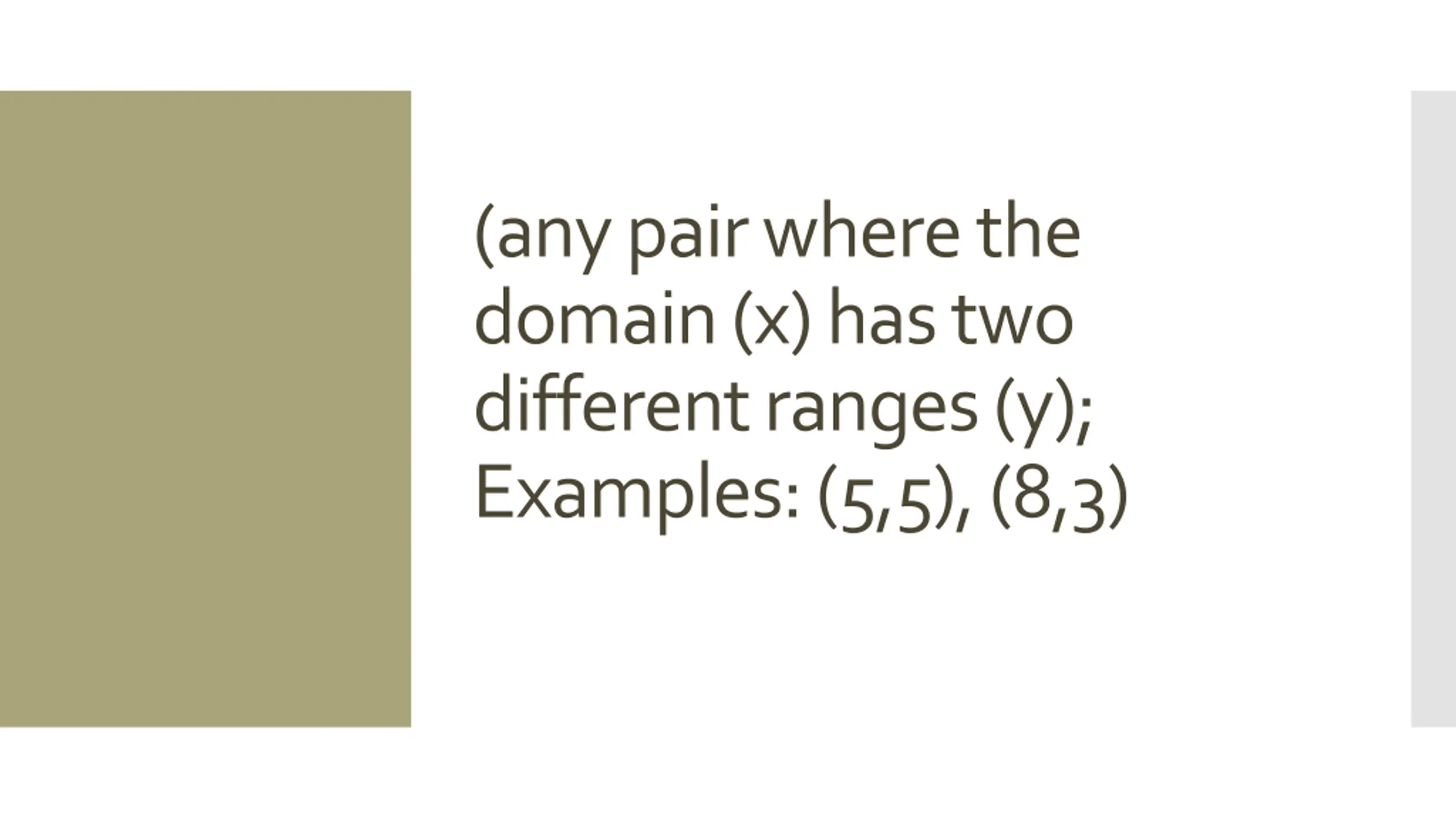 (any pair where the domain (x) has two different ranges (y); Examples: (5,5), (8,3)