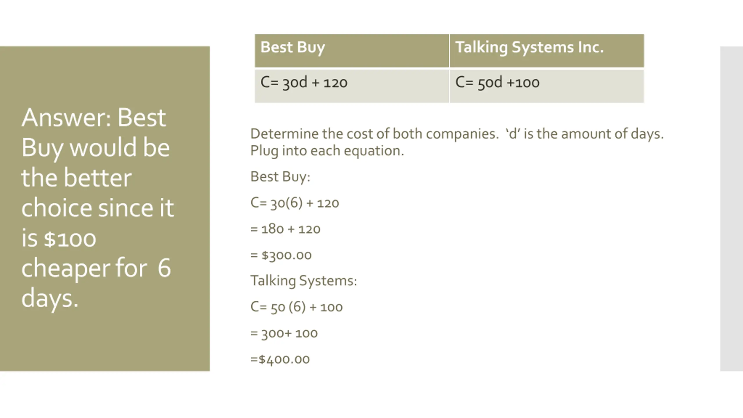 Best Buy Talking Systems Inc. C= 30d + 120 C= 50d +100 Answer: Best Buy would be the better choice since it is $100 cheaper for 6 days. Determine the cost of both companies. d is the amount of days. Plug into each equation. Best Buy: C= 30(6) + 120 = 180 + 120 = $300.00 Talking Systems: C= 50 (6) + 100 = 300+ 100 =$400.00