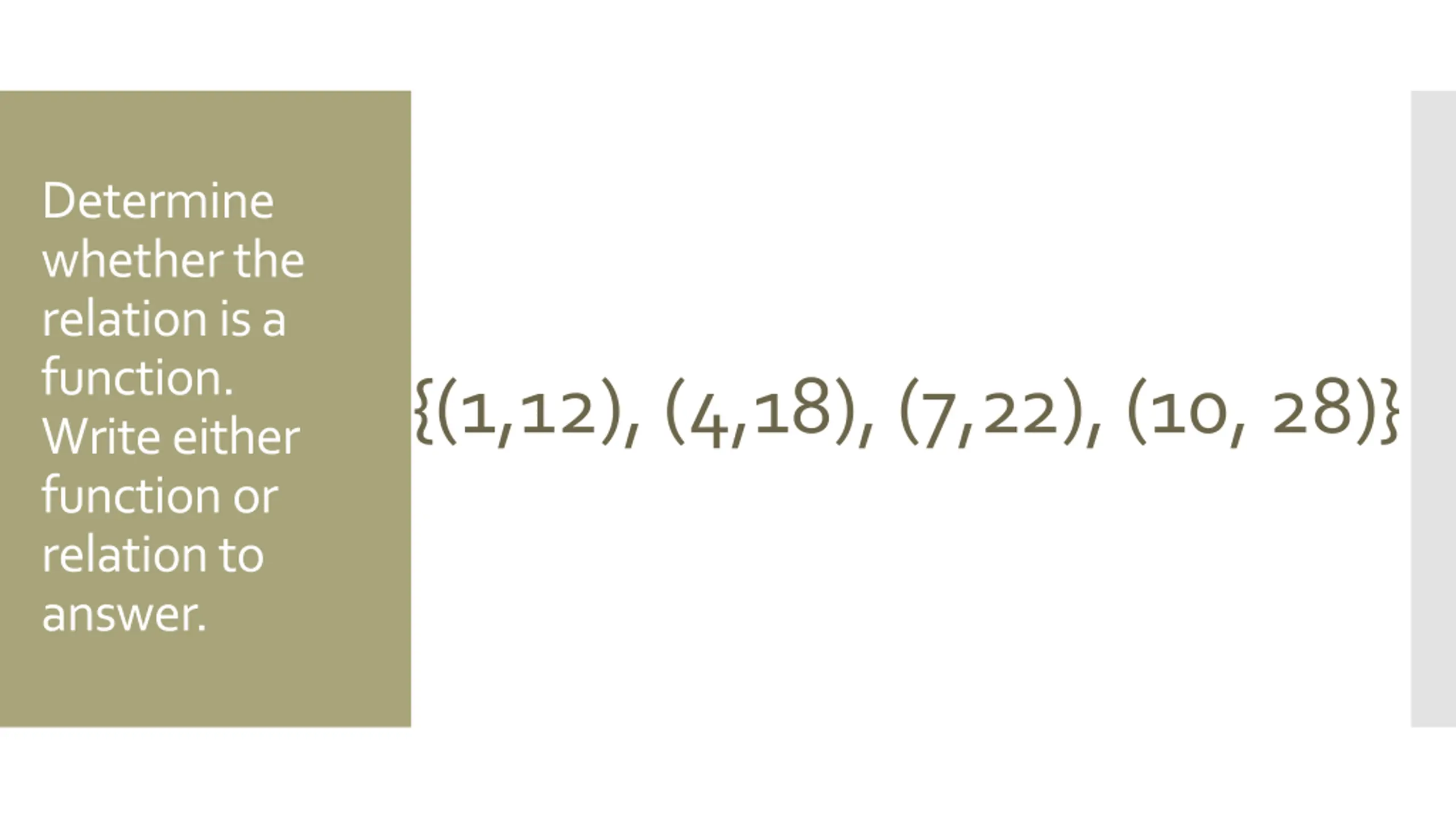 Determine whether the relation is a function. Write either function or relation to answer. {(1,12), (4,18), (7,22), (10, 28)}