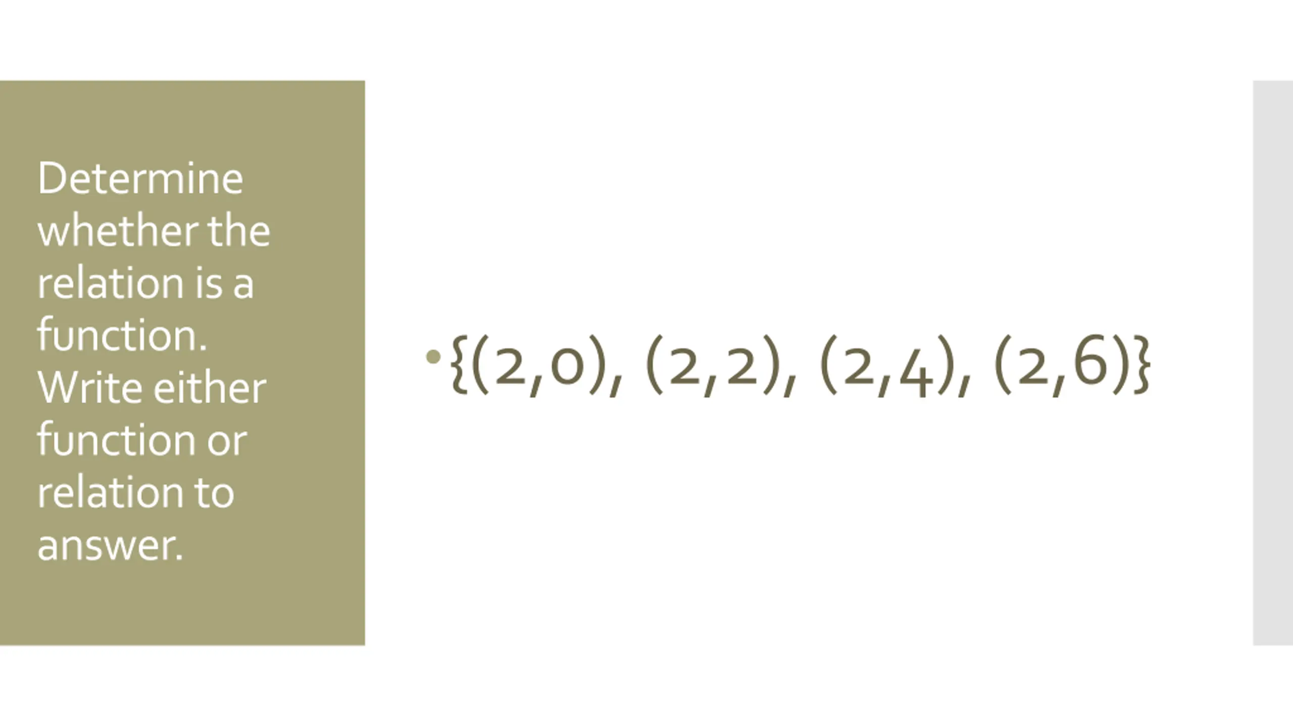 Determine whether the relation is a function. Write either function or relation to answer. {(2,0), (2,2), (2,4), (2,6)}