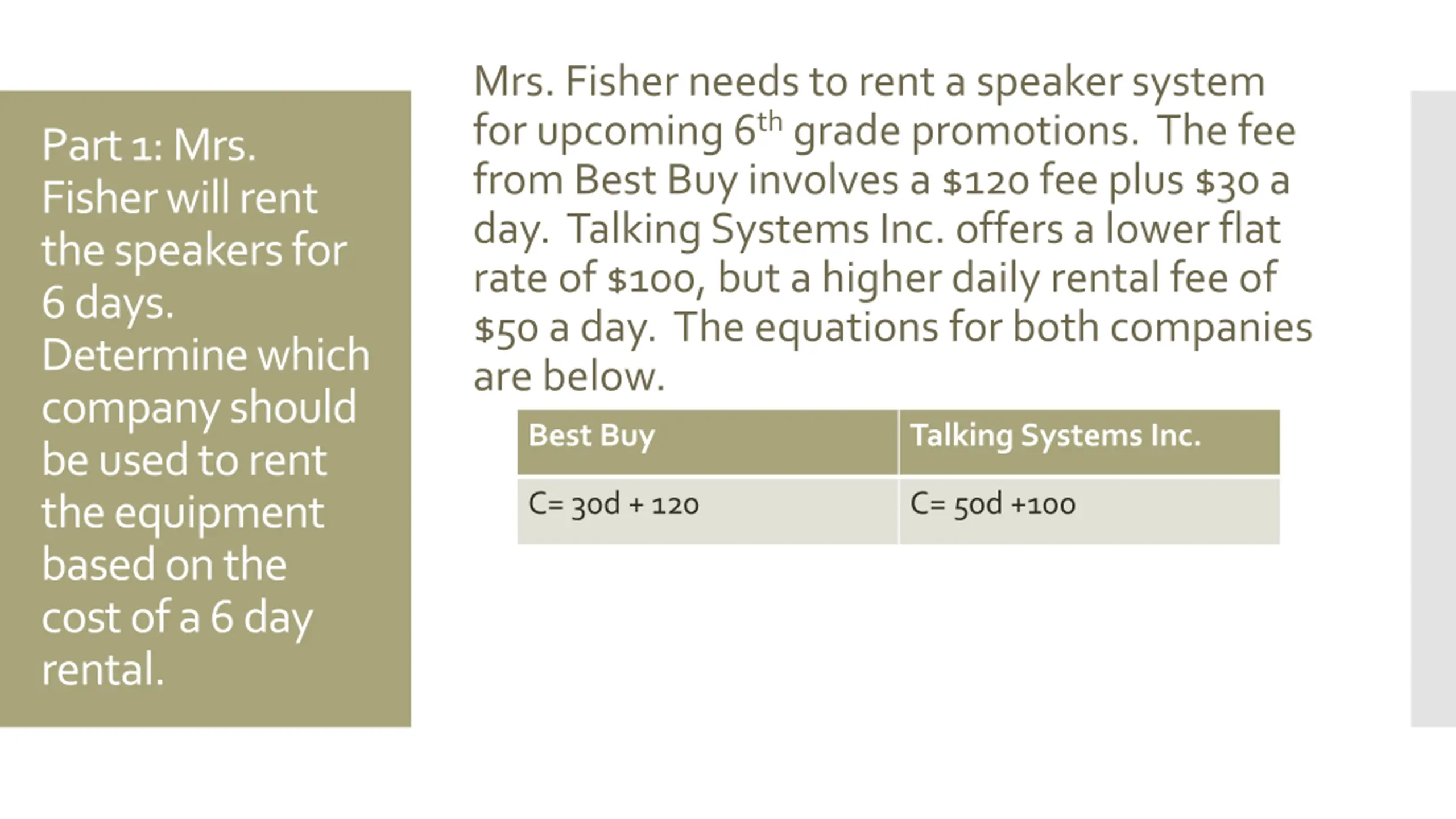 Mrs. Fisher needs to rent a speaker system for upcoming 6th grade promotions. The fee from Best Buy involves a $120 fee plus $30 a day. Talking Systems Inc. offers a lower flat rate of $100, but a higher daily rental fee of $50 a day. The equations for both companies are below. Part 1: Mrs. Fisher will rent the speakers for 6 days. Determine which company should be used to rent the equipment based on the cost of a 6 day rental. Best Buy Talking Systems Inc. C= 30d + 120 C= 50d +100