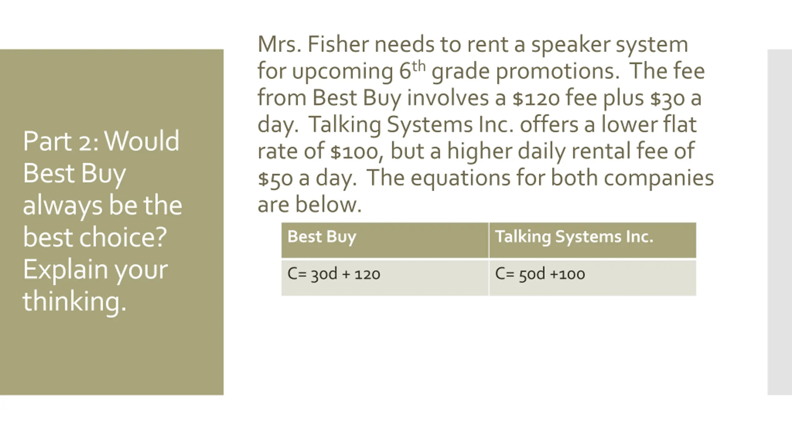 Mrs. Fisher needs to rent a speaker system for upcoming 6th grade promotions. The fee from Best Buy involves a $120 fee plus $30 a day. Talking Systems Inc. offers a lower flat rate of $100, but a higher daily rental fee of $50 a day. The equations for both companies are below. Part 2: Would Best Buy always be the best choice? Explain your thinking. Best Buy Talking Systems Inc. C= 30d + 120 C= 50d +100