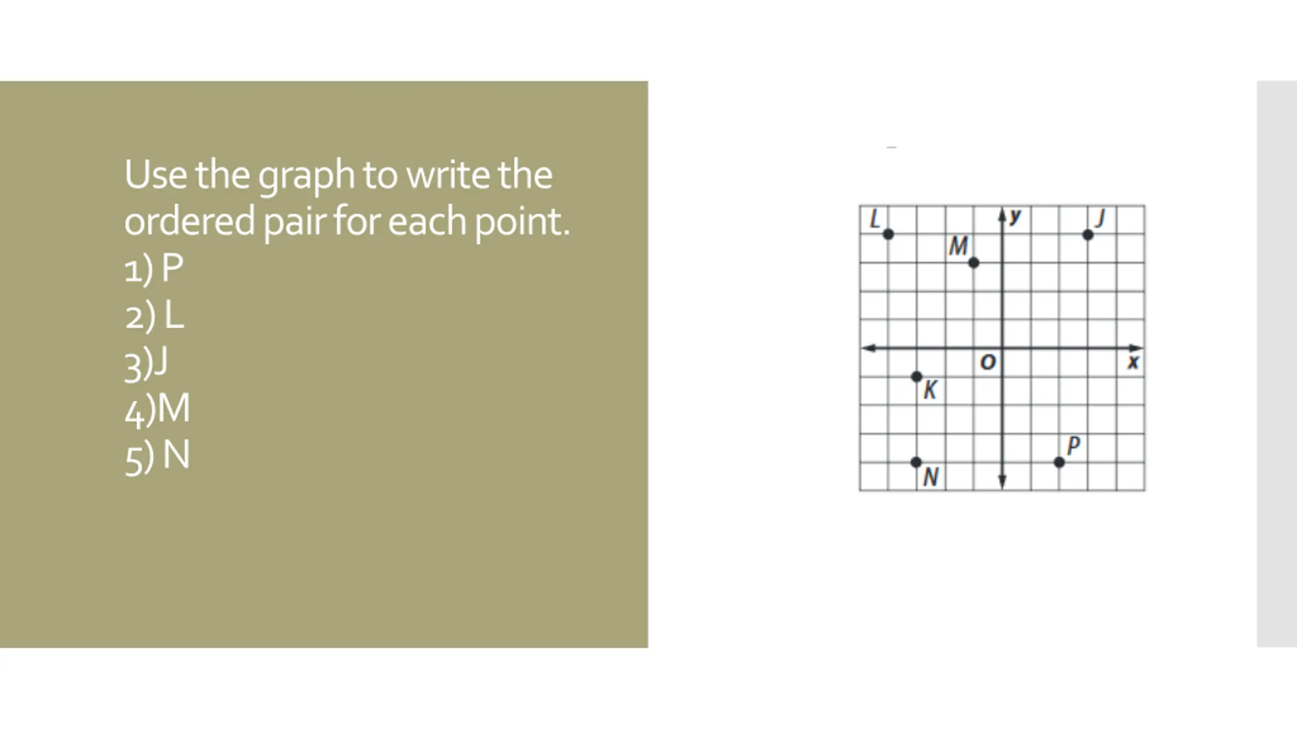 Use the graph to write the ordered pair for each point. 1) P 2) L 3)J 4)M 5) N