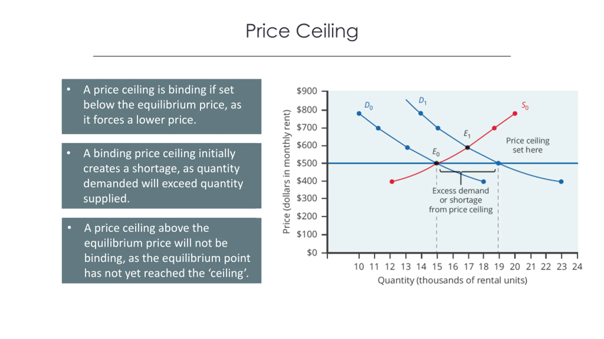 Price Ceiling A price ceiling is binding if set below the equilibrium price, as it forces a lower price. A binding price ceiling initially creates a shortage, as quantity demanded will exceed quantity supplied. A price ceiling above the equilibrium price will not be binding, as the equilibrium point has not yet reached the ceiling .