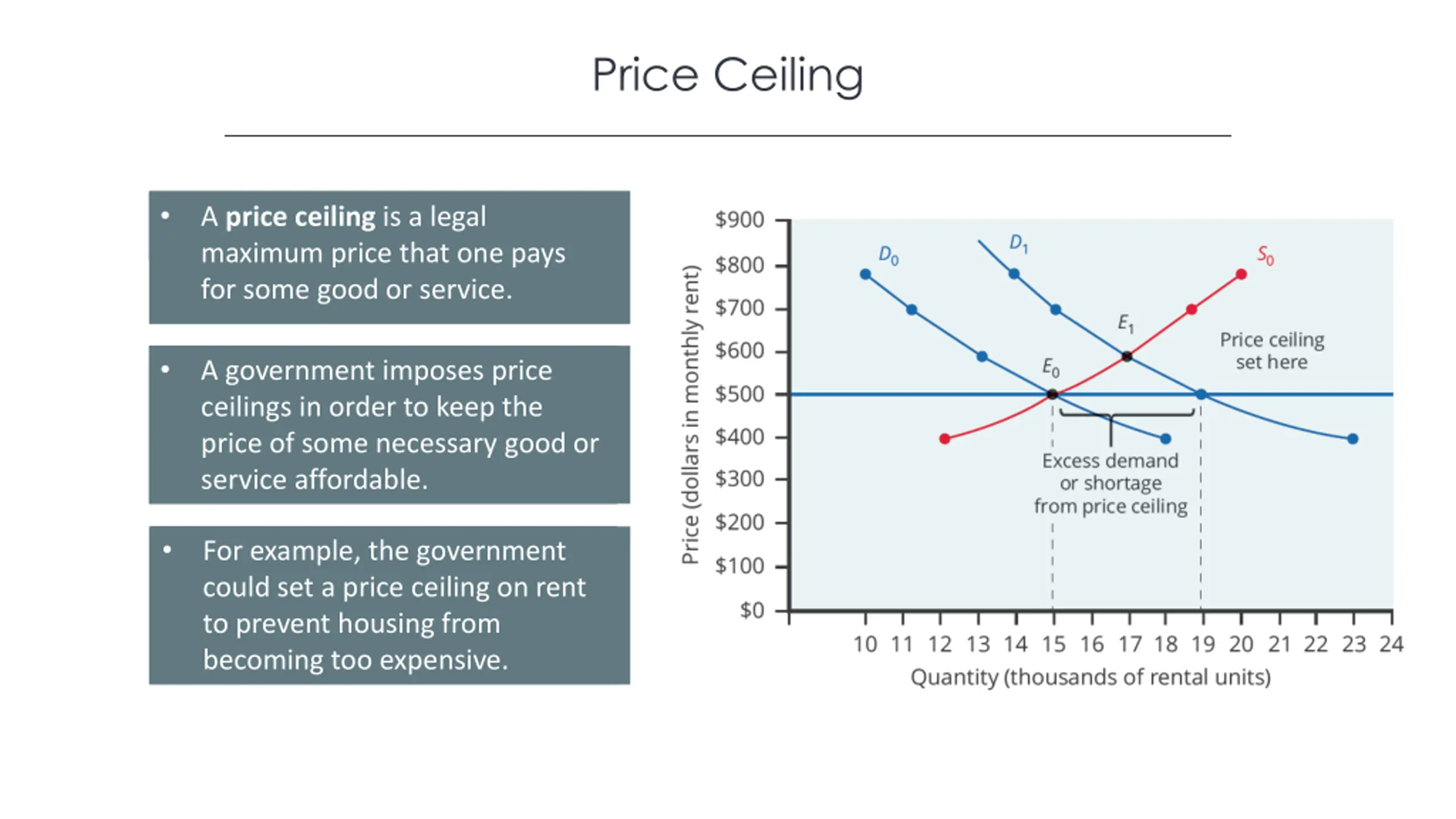 Price Ceiling A price ceiling is a legal maximum price that one pays for some good or service. A government imposes price ceilings in order to keep the price of some necessary good or service affordable. For example, the government could set a price ceiling on rent to prevent housing from becoming too expensive.