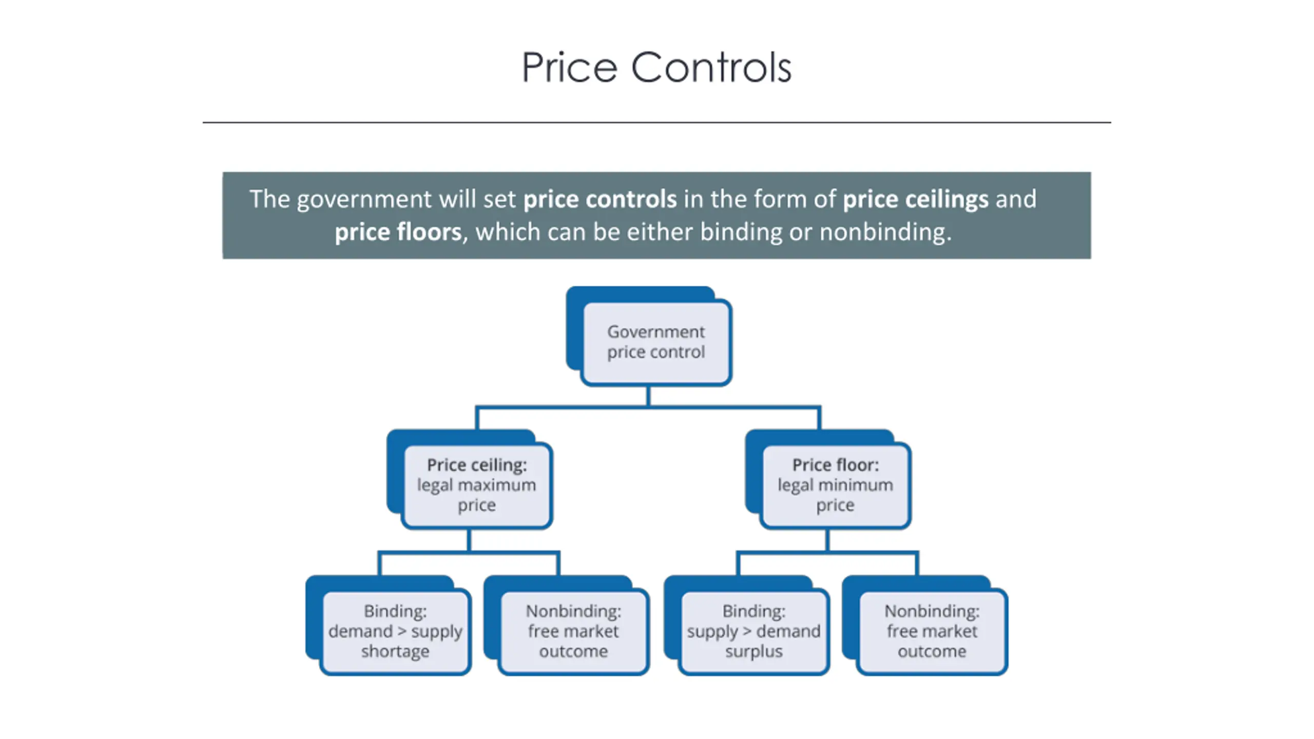 Price Controls The government will set price controls in the form of price ceilings and price floors, which can be either binding or nonbinding.
