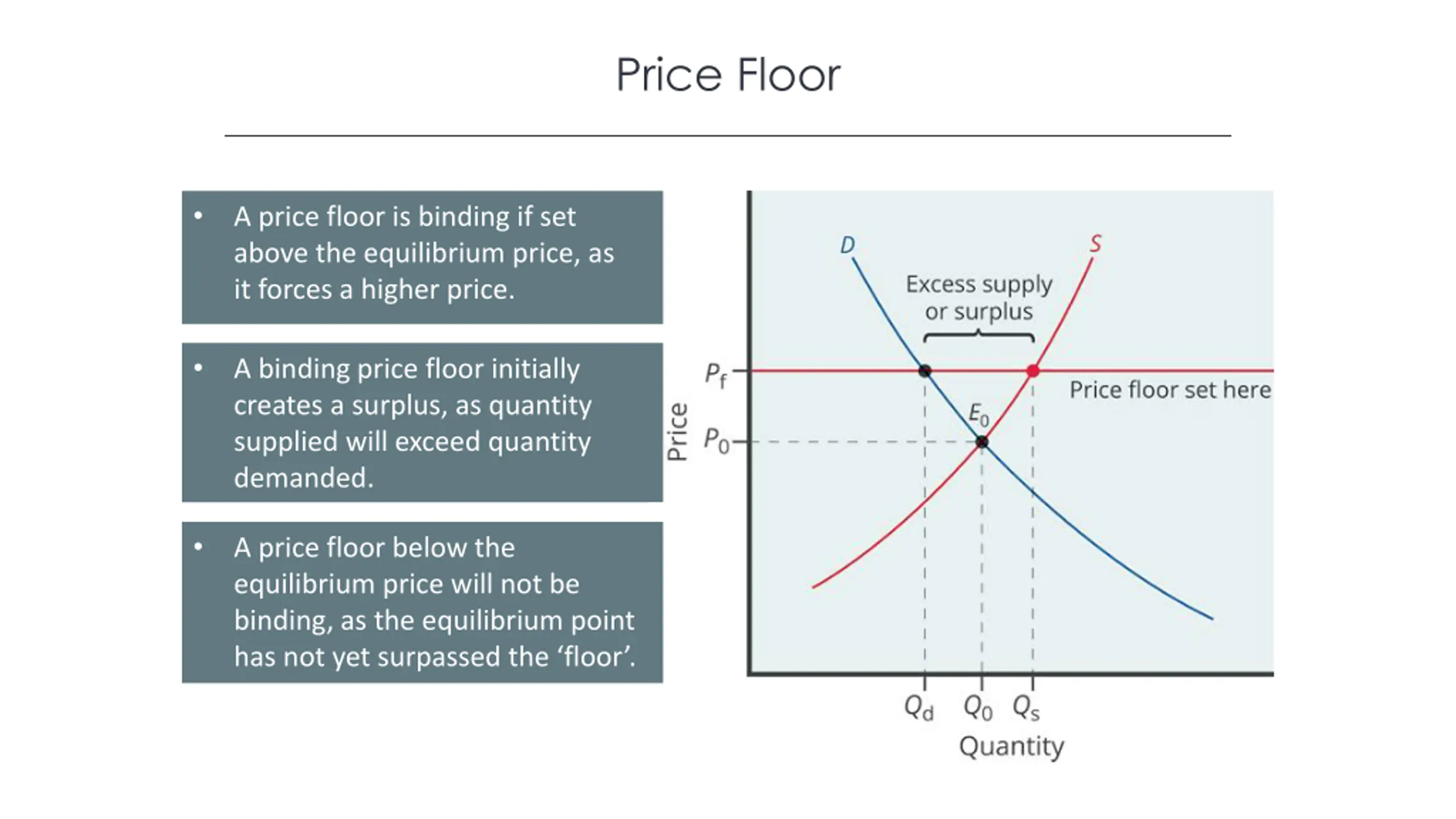 Price Floor A price floor is binding if set above the equilibrium price, as it forces a higher price. A binding price floor initially creates a surplus, as quantity supplied will exceed quantity demanded. A price floor below the equilibrium price will not be binding, as the equilibrium point has not yet surpassed the floor .