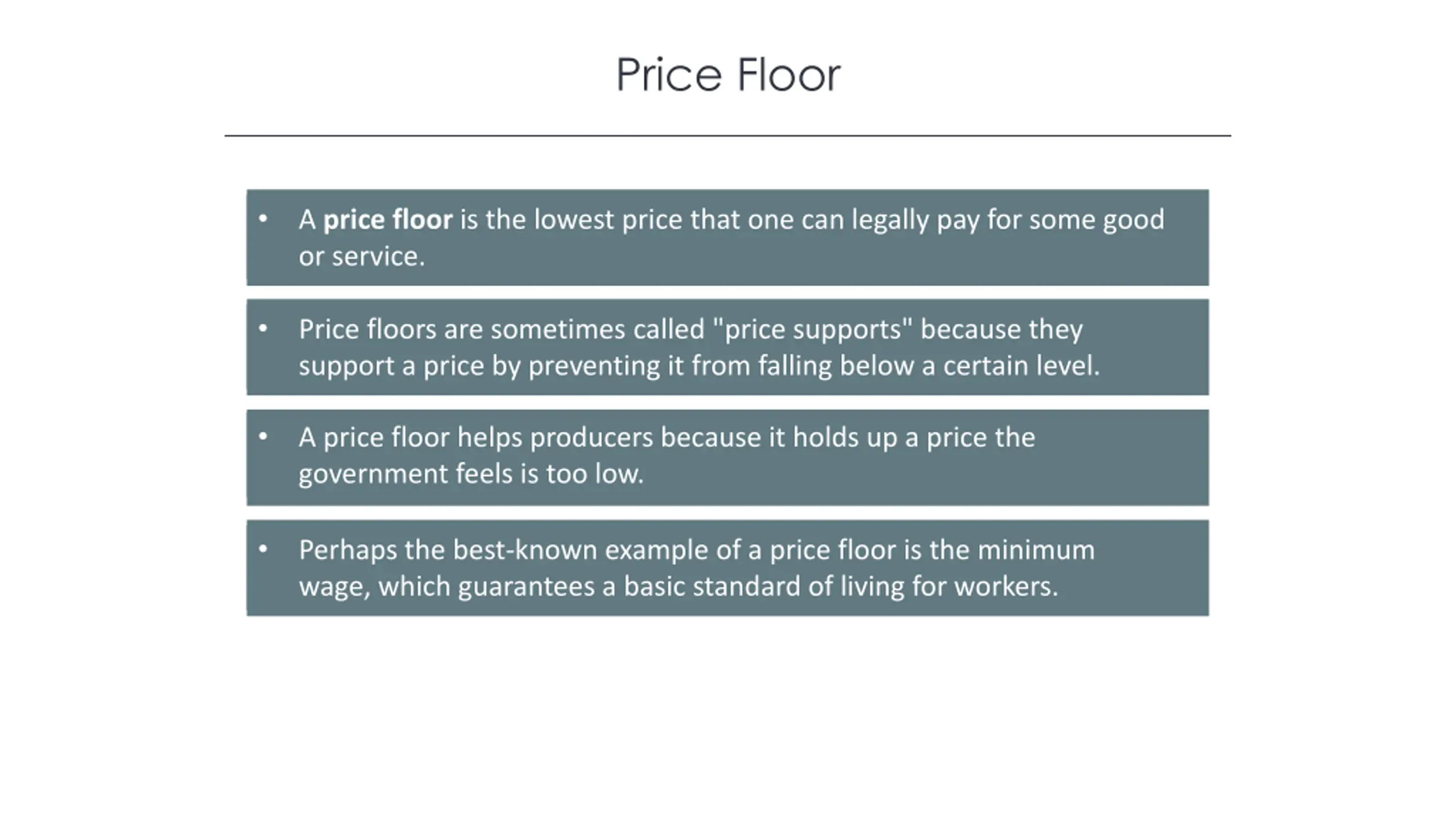 Price Floor A price floor is the lowest price that one can legally pay for some good or service. Price floors are sometimes called "price supports" because they support a price by preventing it from falling below a certain level. A price floor helps producers because it holds up a price the government feels is too low. Perhaps the best-known example of a price floor is the minimum wage, which guarantees a basic standard of living for workers.