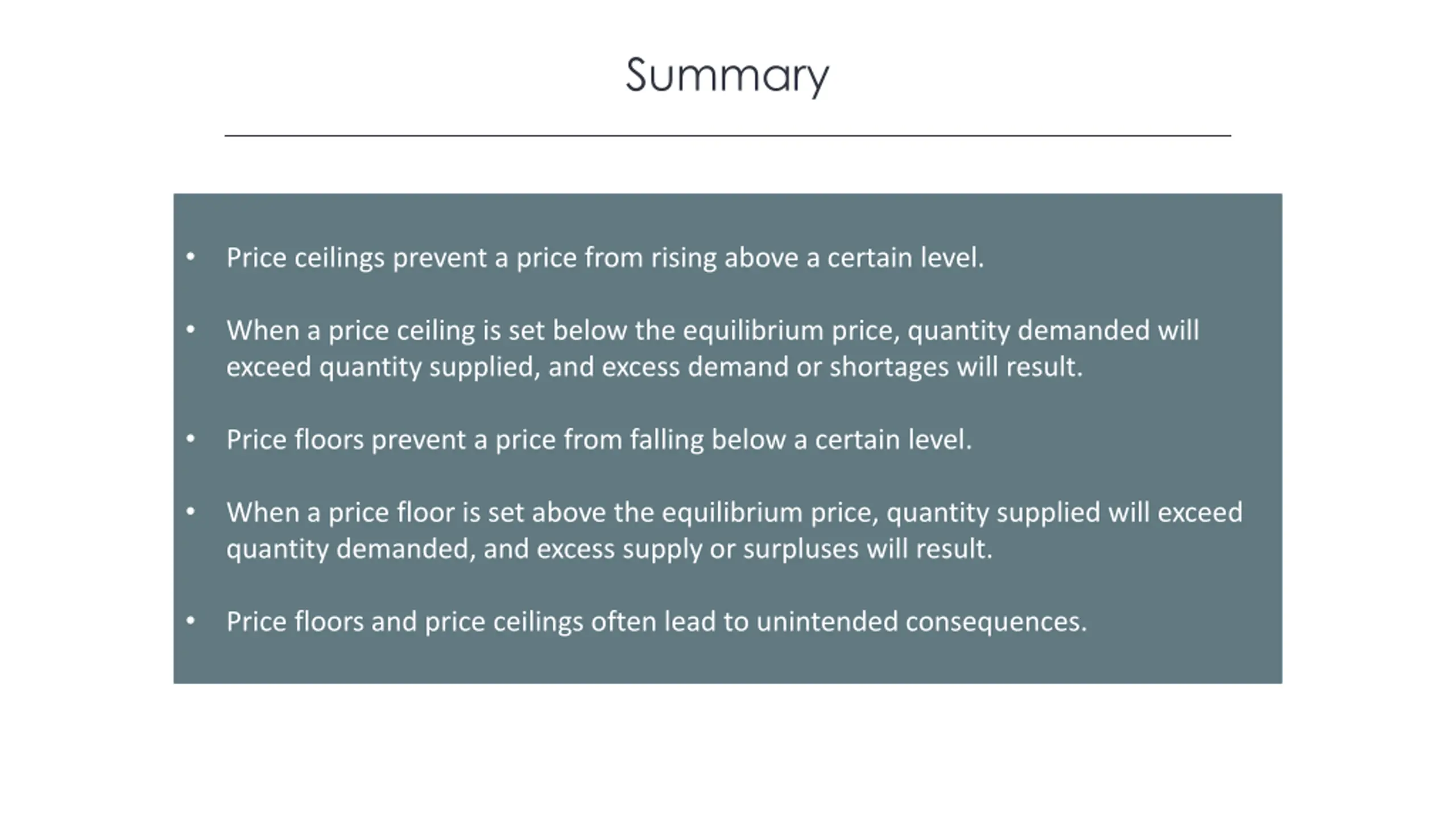 Summary Price ceilings prevent a price from rising above a certain level. When a price ceiling is set below the equilibrium price, quantity demanded will exceed quantity supplied, and excess demand or shortages will result. Price floors prevent a price from falling below a certain level. When a price floor is set above the equilibrium price, quantity supplied will exceed quantity demanded, and excess supply or surpluses will result. Price floors and price ceilings often lead to unintended consequences.