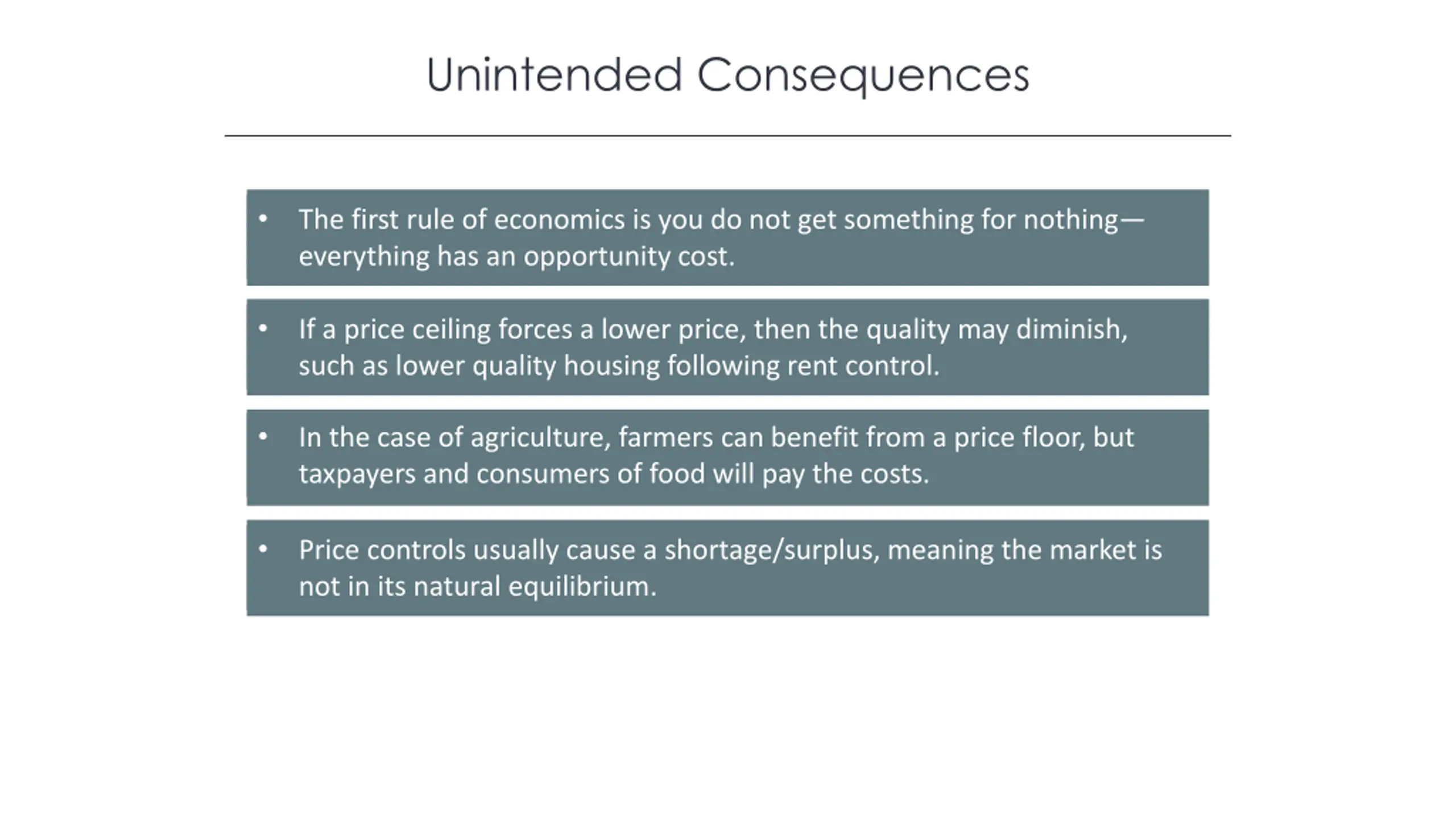 Unintended Consequences The first rule of economics is you do not get something for nothing everything has an opportunity cost. If a price ceiling forces a lower price, then the quality may diminish, such as lower quality housing following rent control. In the case of agriculture, farmers can benefit from a price floor, but taxpayers and consumers of food will pay the costs. Price controls usually cause a shortage/surplus, meaning the market is not in its natural equilibrium.
