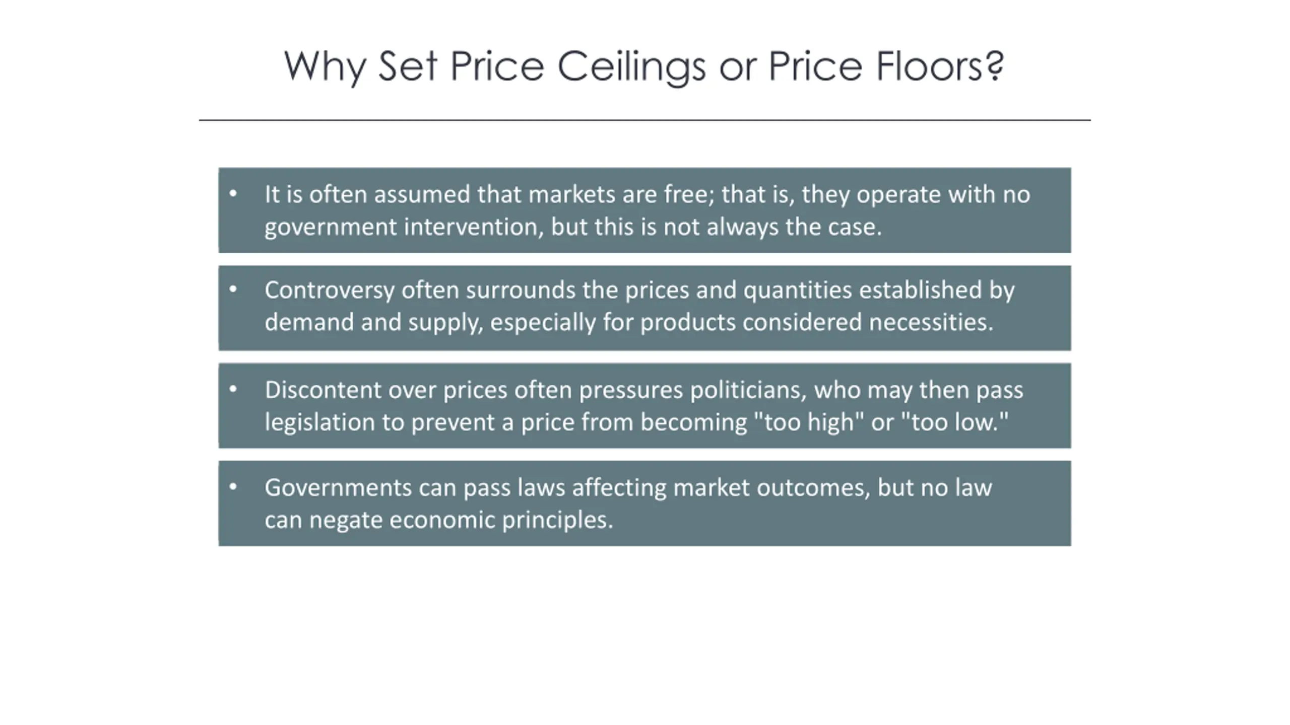 Why Set Price Ceilings or Price Floors? It is often assumed that markets are free; that is, they operate with no government intervention, but this is not always the case. Controversy often surrounds the prices and quantities established by demand and supply, especially for products considered necessities. Discontent over prices often pressures politicians, who may then pass legislation to prevent a price from becoming "too high" or "too low." Governments can pass laws affecting market outcomes, but no law can negate economic principles.