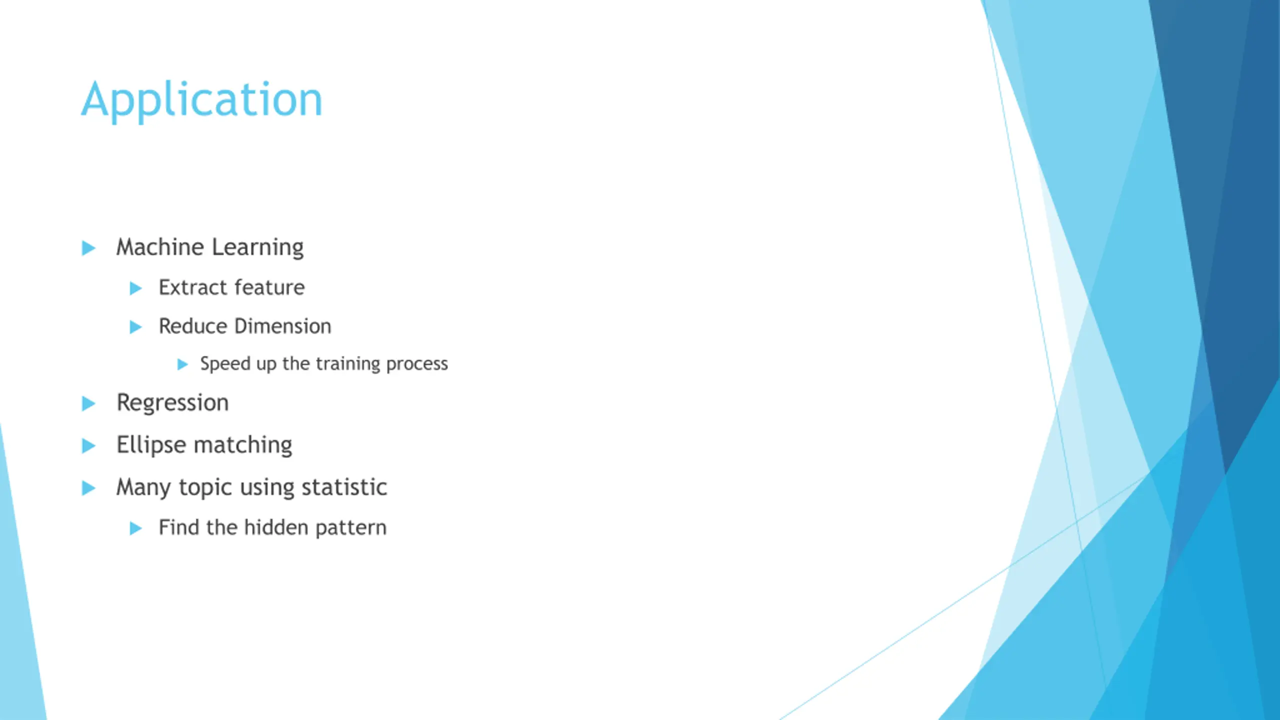 Application Machine Learning Extract feature Reduce Dimension Speed up the training process Regression Ellipse matching Many topic using statistic Find the hidden pattern