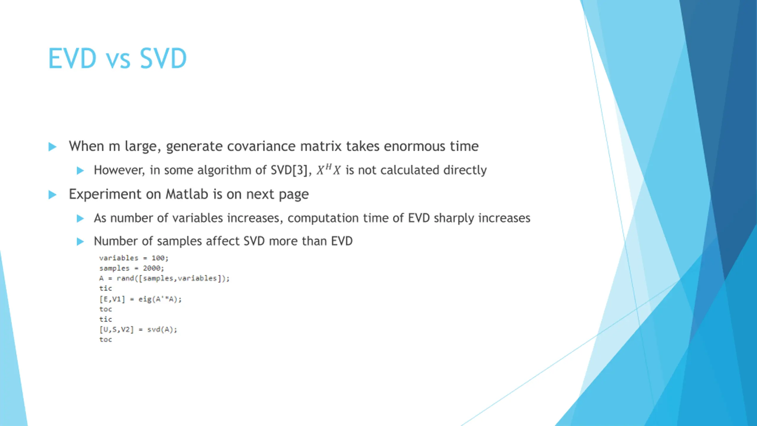 EVD vs SVD When m large, generate covariance matrix takes enormous time However, in some algorithm of SVD[3], ??? is not calculated directly Experiment on Matlab is on next page As number of variables increases, computation time of EVD sharply increases Number of samples affect SVD more than EVD