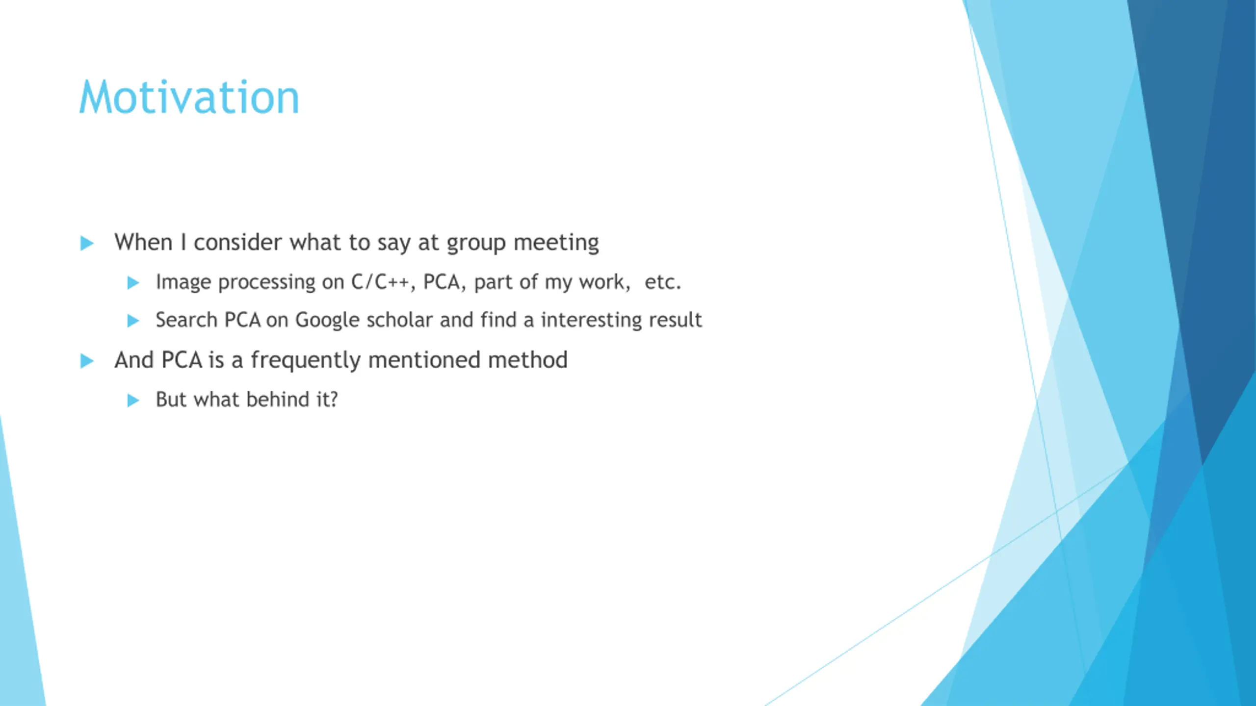 Motivation When I consider what to say at group meeting Image processing on C/C++, PCA, part of my work, etc. Search PCA on Google scholar and find a interesting result And PCA is a frequently mentioned method But what behind it?