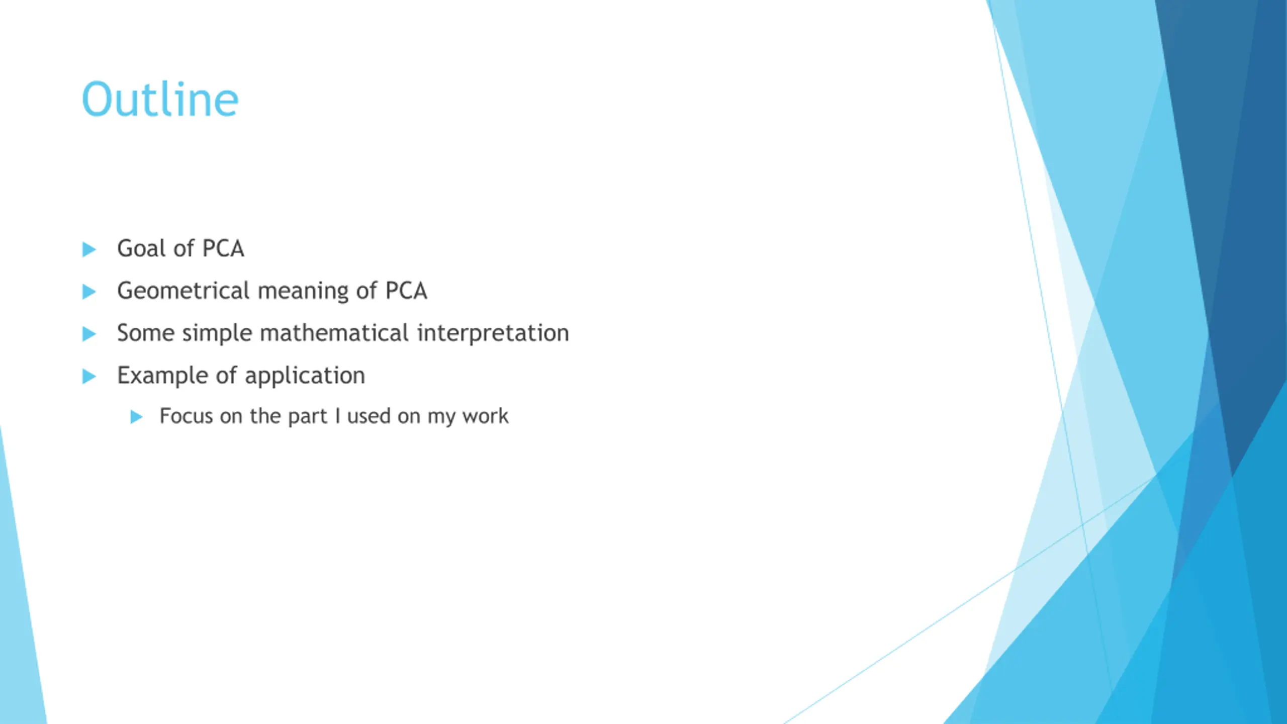 Outline Goal of PCA Geometrical meaning of PCA Some simple mathematical interpretation Example of application Focus on the part I used on my work