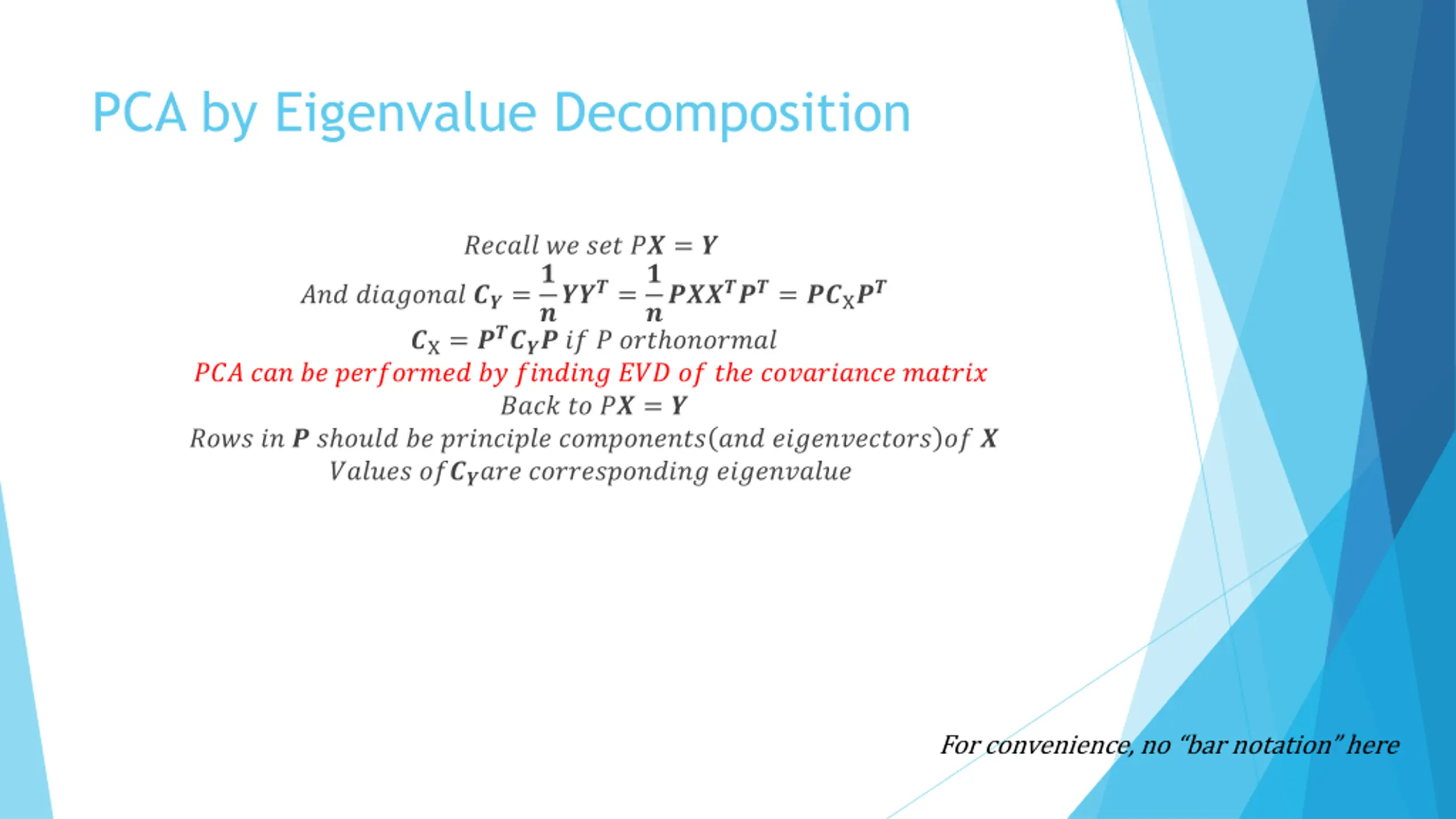 PCA by Eigenvalue Decomposition ?????? ?? ??? ?? = ? ????=? ?X= ????? ?? ? ??? ??????? ??? ???????? ??=? ???????= ??X?? ??? ??? ?? ????????? ?? ??????? ??? ?? ? ? ?????????? ?????? ???? ?? ?? = ? ???? ?? ? ? ???? ?? ????????? ?????????? ??? ???????????? ?? ? ?????? ??????? ????????????? ?????????? For convenience, no bar notation here