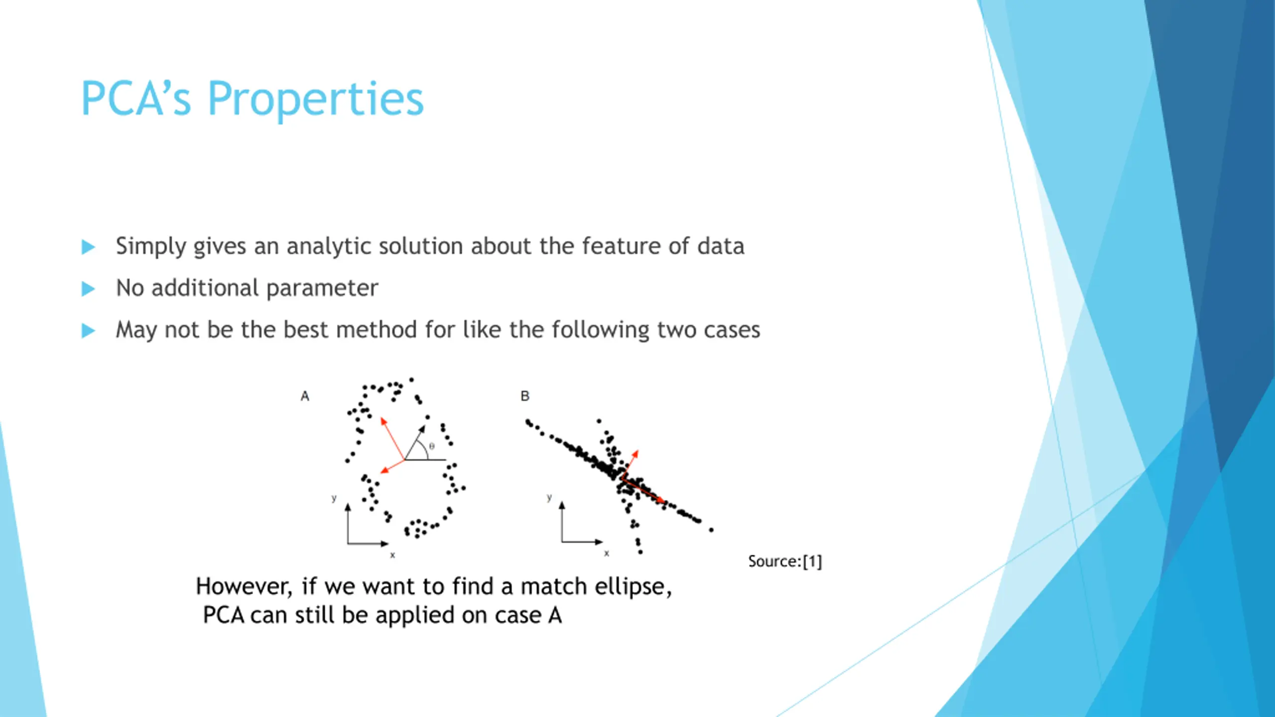 PCAs Properties Simply gives an analytic solution about the feature of data No additional parameter May not be the best method for like the following two cases Source:[1] However, if we want to find a match ellipse, PCA can still be applied on case A