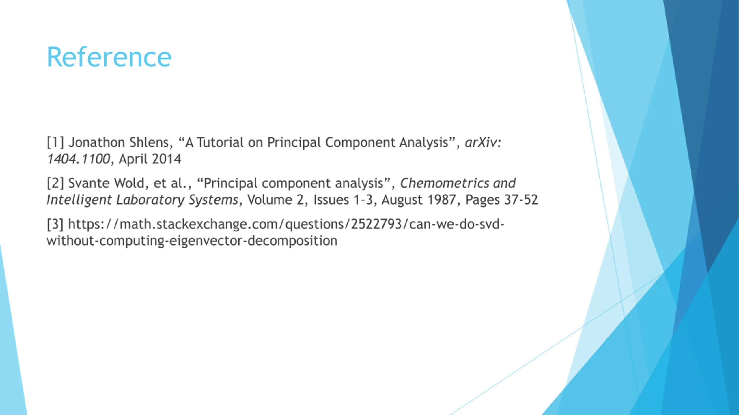 Reference [1] Jonathon Shlens, A Tutorial on Principal Component Analysis , arXiv: 1404.1100, April 2014 [2] Svante Wold, et al., Principal component analysis , Chemometrics and Intelligent Laboratory Systems, Volume 2, Issues 1 3, August 1987, Pages 37-52 [3] https://math.stackexchange.com/questions/2522793/can-we-do-svd- without-computing-eigenvector-decomposition