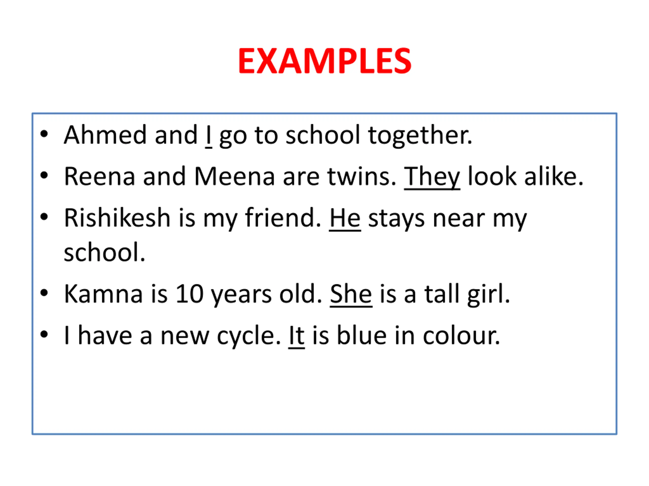 EXAMPLES Ahmed and I go to school together. Reena and Meena are twins. They look alike. Rishikesh is my friend. He stays near my school. Kamna is 10 years old. She is a tall girl. I have a new cycle. It is blue in colour.