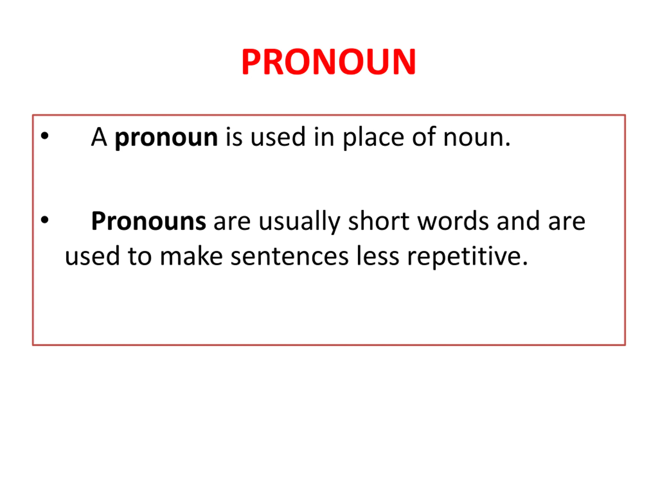 PRONOUN A pronoun is used in place of noun. Pronouns are usually short words and are used to make sentences less repetitive.
