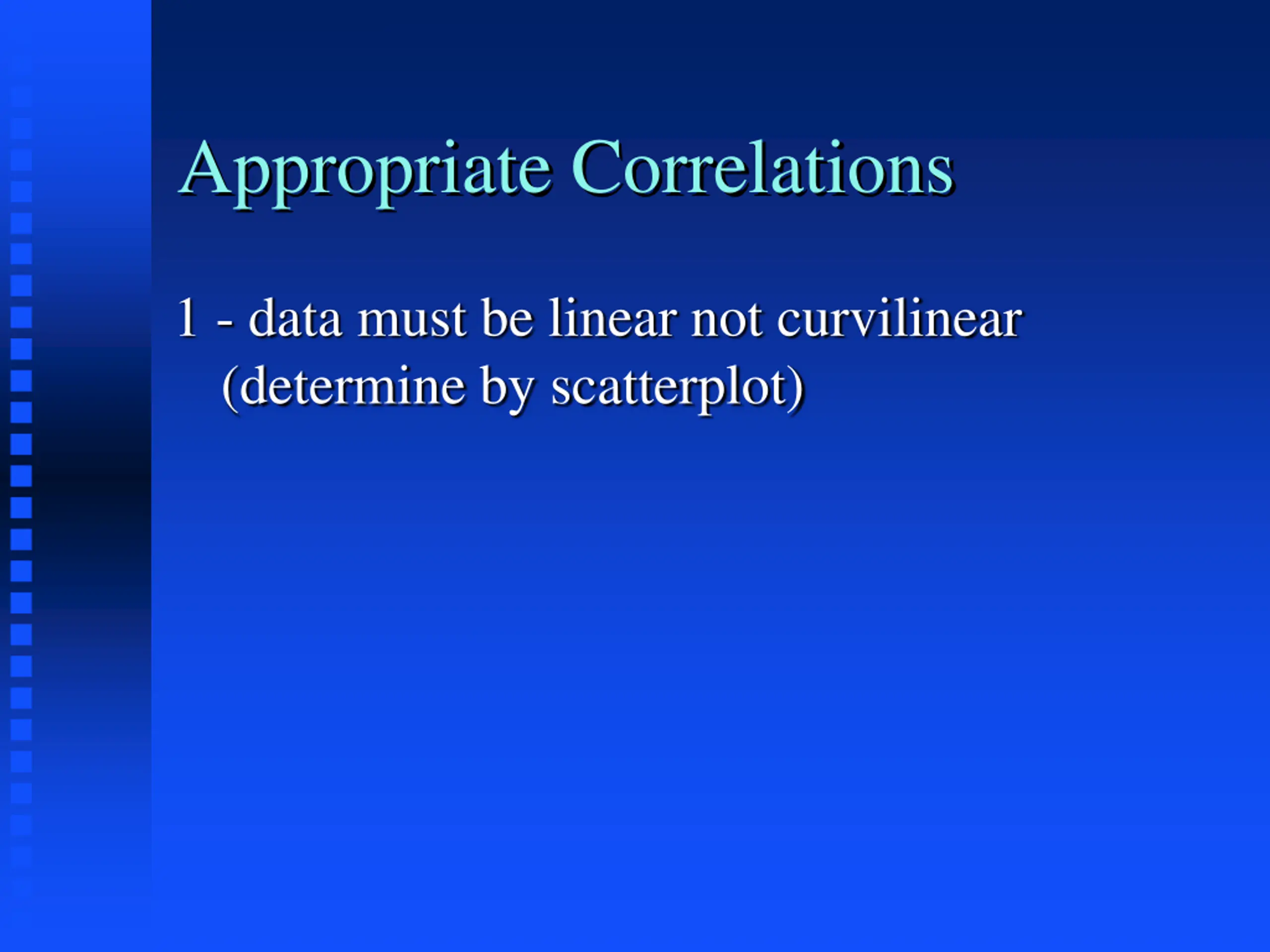 Appropriate Correlations 1 - data must be linear not curvilinear (determine by scatterplot)
