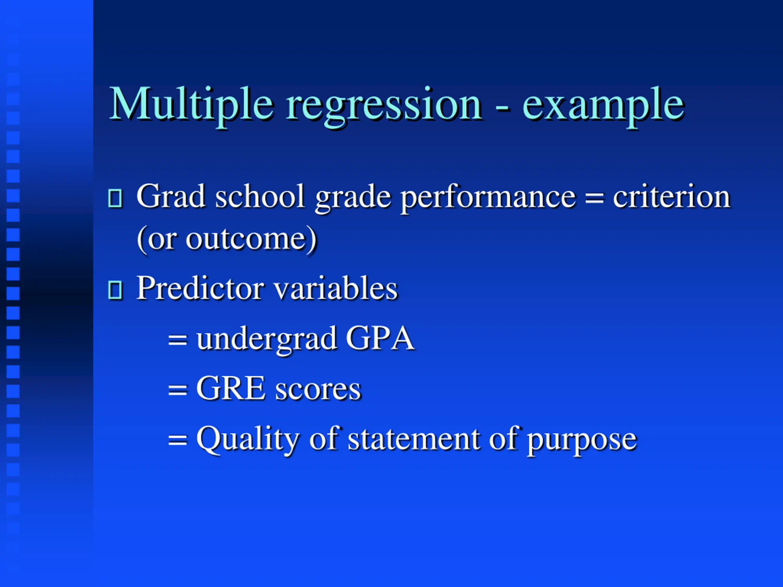 Multiple regression - example Grad school grade performance = criterion (or outcome) Predictor variables = undergrad GPA = GRE scores = Quality of statement of purpose