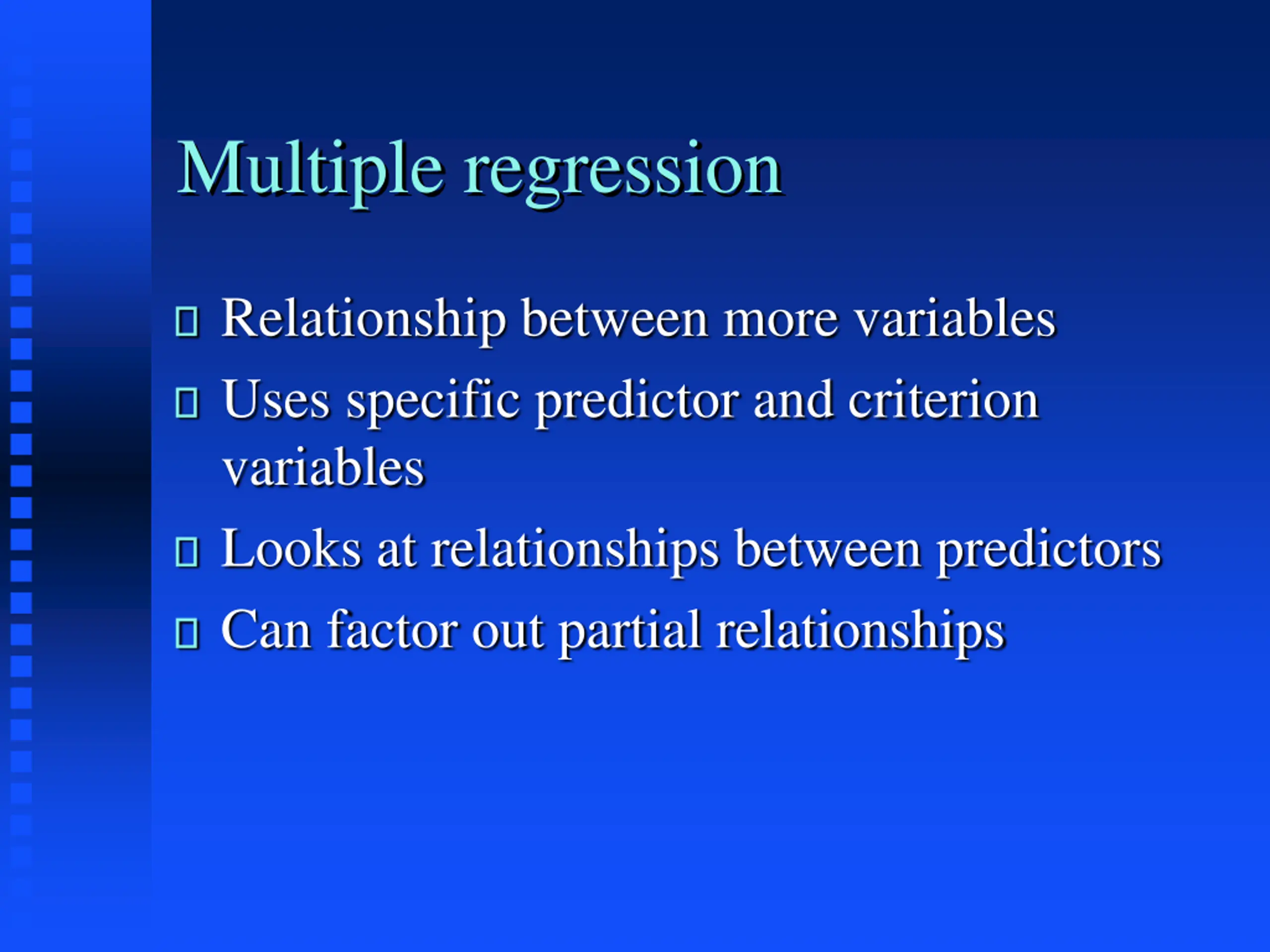 Multiple regression Relationship between more variables Uses specific predictor and criterion variables Looks at relationships between predictors Can factor out partial relationships