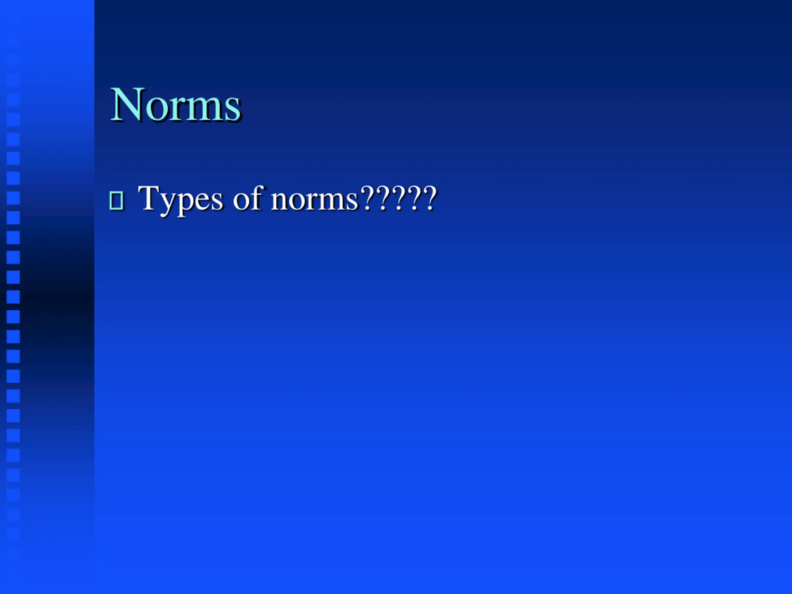 Criterion vs Norm referenced Criterion reference = compares to established standard, well defined objectives Norm referenced = compares each score to other scores, relative
