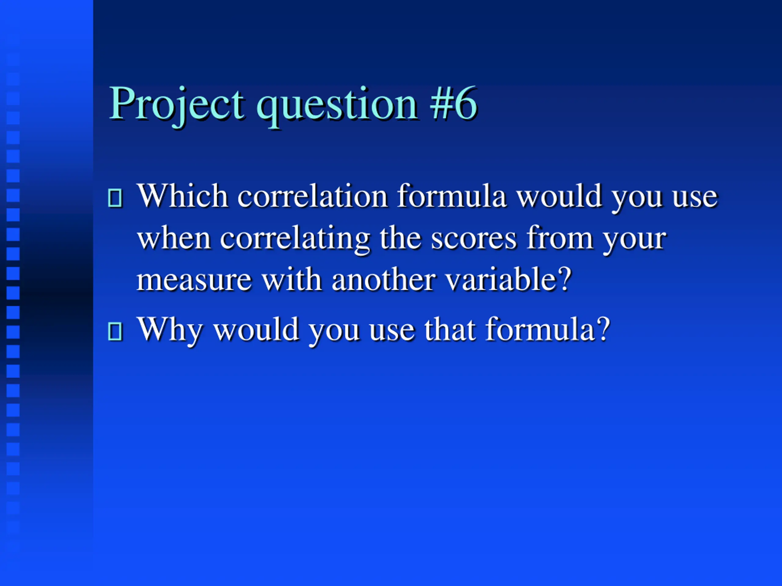 Project question #6 Which correlation formula would you use when correlating the scores from your measure with another variable? Why would you use that formula?