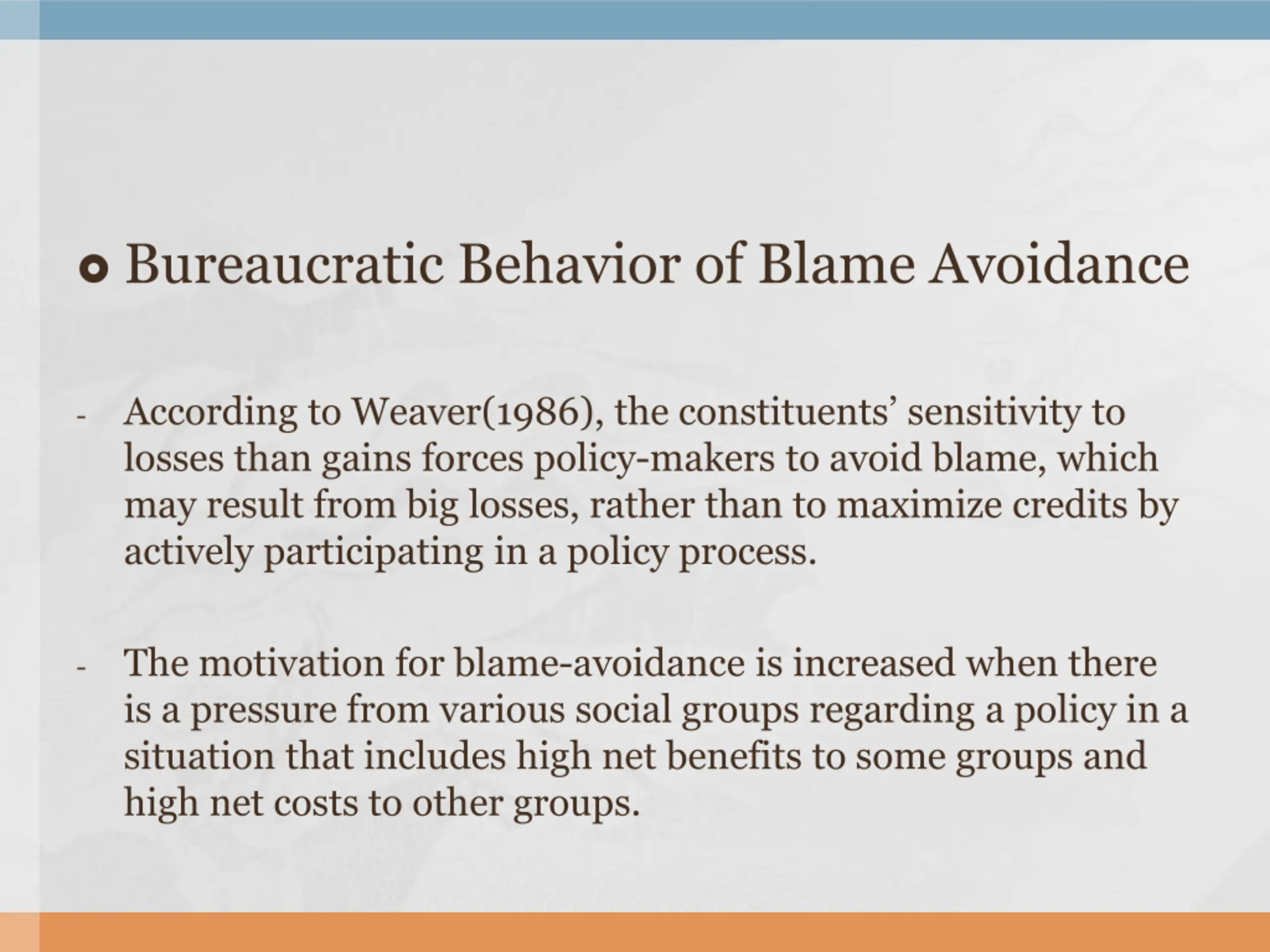 Bureaucratic Behavior of Blame Avoidance According to Weaver(1986), the constituents sensitivity to losses than gains forces policy-makers to avoid blame, which may result from big losses, rather than to maximize credits by actively participating in a policy process. - The motivation for blame-avoidance is increased when there is a pressure from various social groups regarding a policy in a situation that includes high net benefits to some groups and high net costs to other groups. -