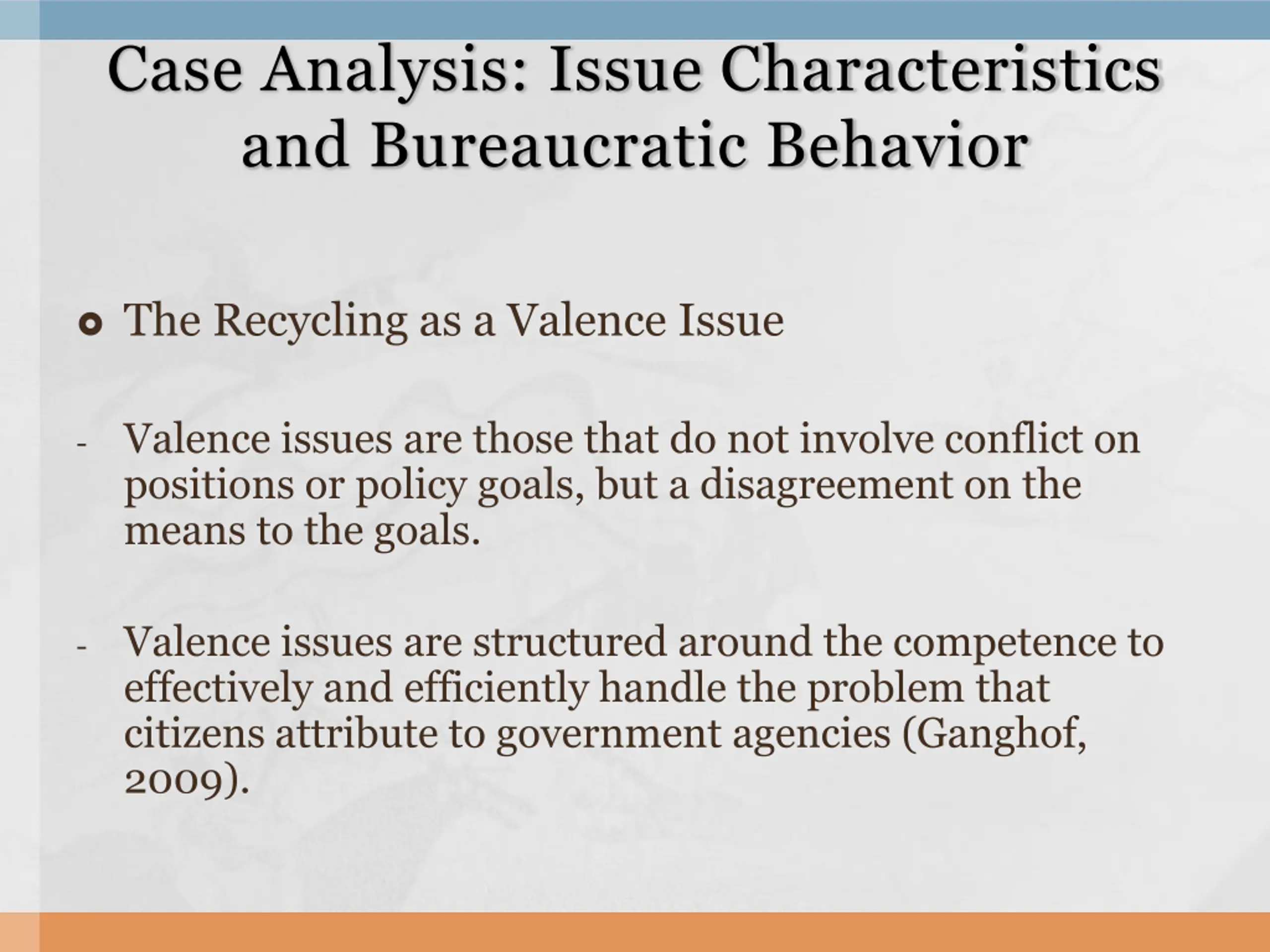Case Analysis: Issue Characteristics and Bureaucratic Behavior The Recycling as a Valence Issue - Valence issues are those that do not involve conflict on positions or policy goals, but a disagreement on the means to the goals. - Valence issues are structured around the competence to effectively and efficiently handle the problem that citizens attribute to government agencies (Ganghof, 2009).