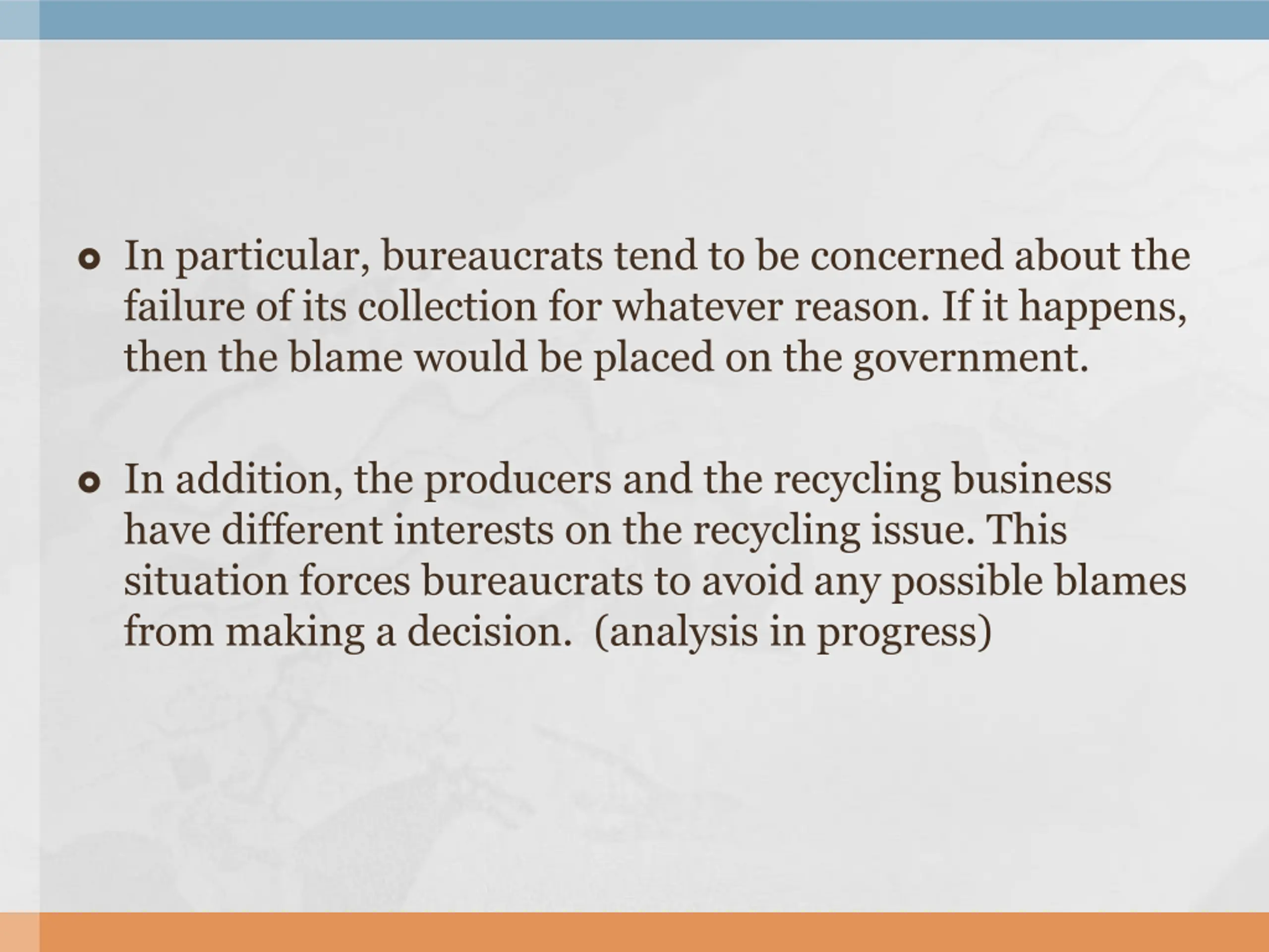 In particular, bureaucrats tend to be concerned about the failure of its collection for whatever reason. If it happens, then the blame would be placed on the government. In addition, the producers and the recycling business have different interests on the recycling issue. This situation forces bureaucrats to avoid any possible blames from making a decision. (analysis in progress)