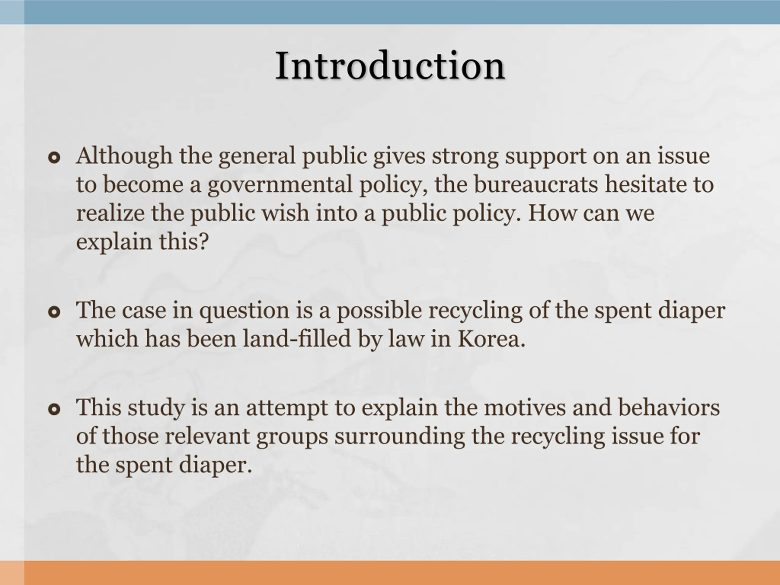 Introduction Although the general public gives strong support on an issue to become a governmental policy, the bureaucrats hesitate to realize the public wish into a public policy. How can we explain this? The case in question is a possible recycling of the spent diaper which has been land-filled by law in Korea. This study is an attempt to explain the motives and behaviors of those relevant groups surrounding the recycling issue for the spent diaper.