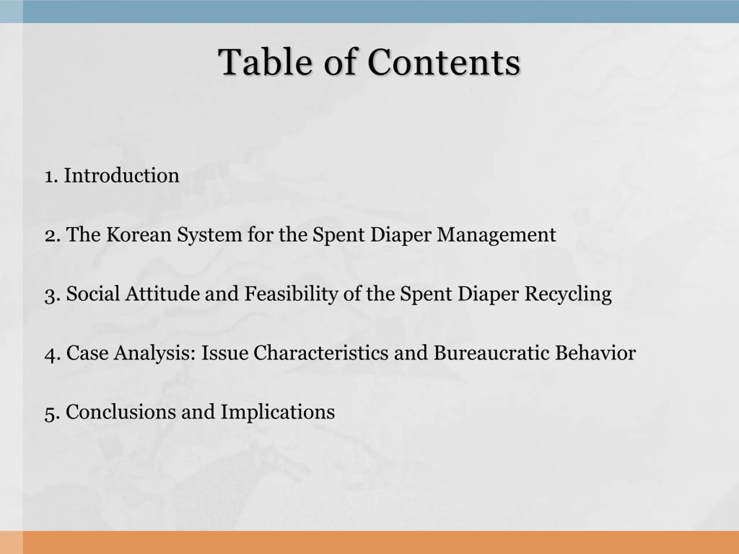 Table of Contents 1. Introduction 2. The Korean System for the Spent Diaper Management 3. Social Attitude and Feasibility of the Spent Diaper Recycling 4. Case Analysis: Issue Characteristics and Bureaucratic Behavior 5. Conclusions and Implications