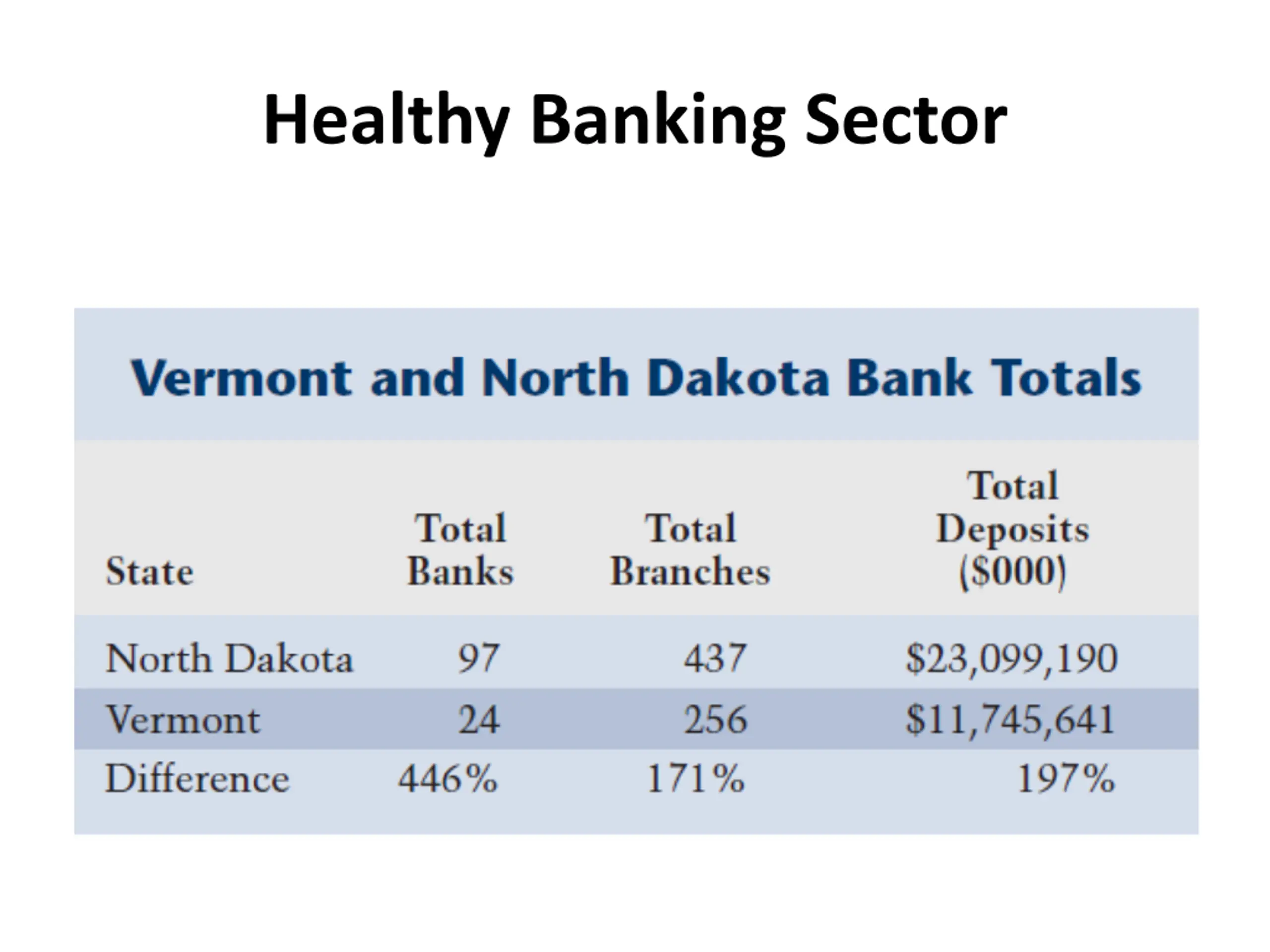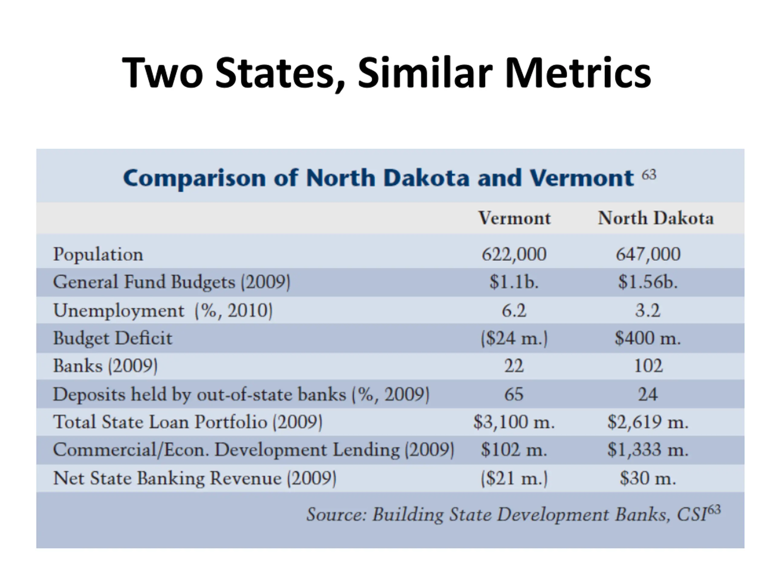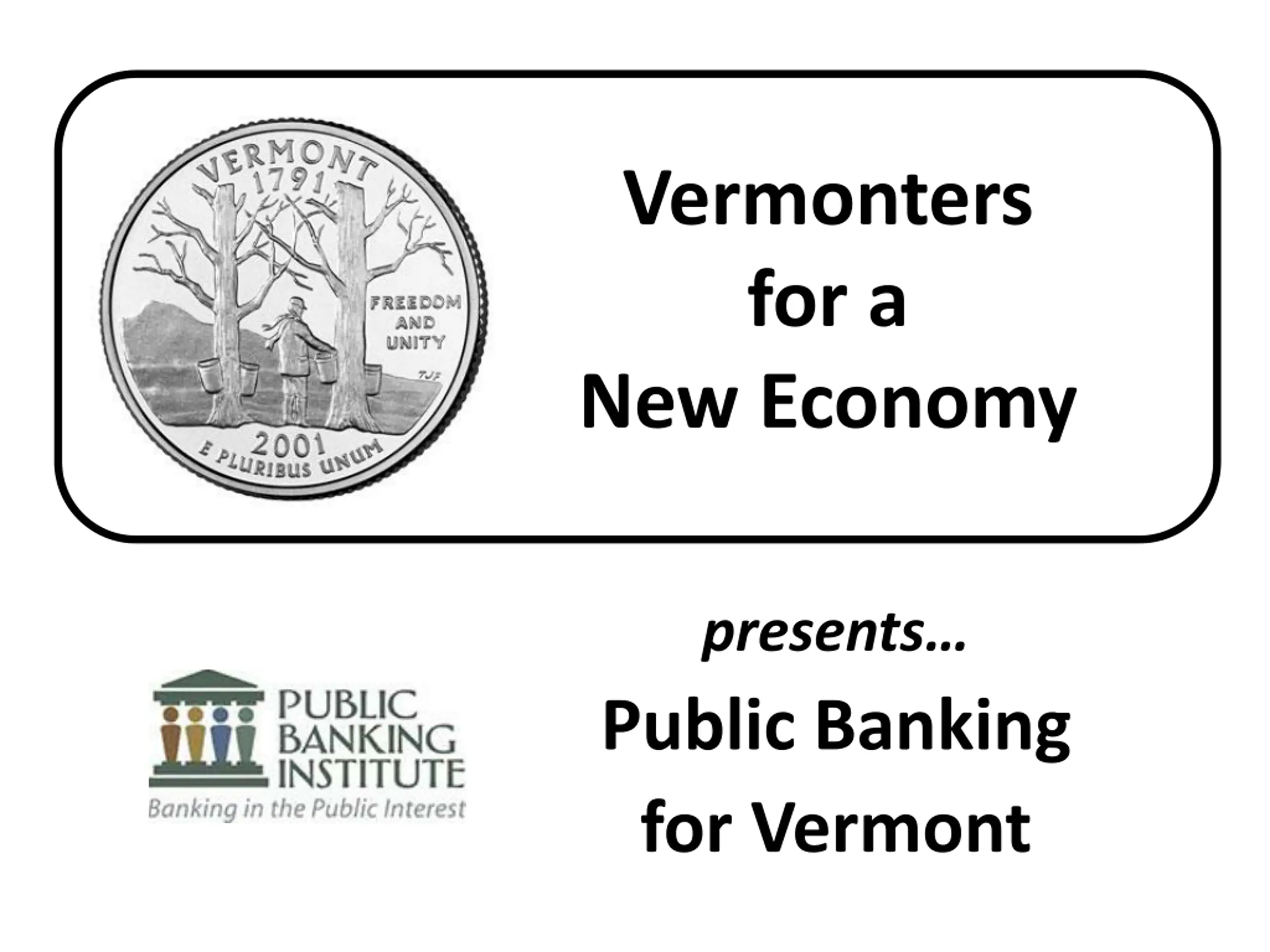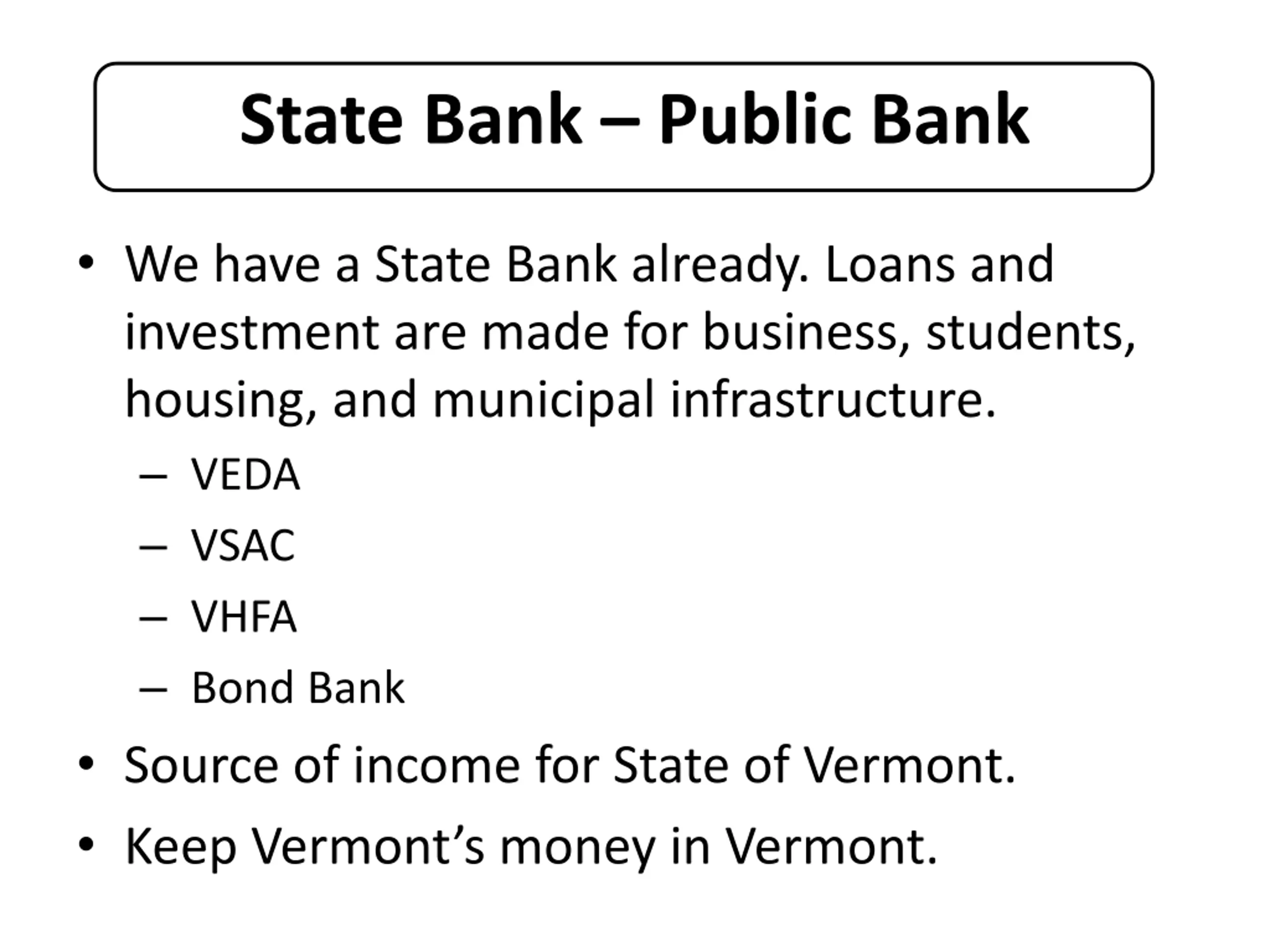State Bank Public Bank We have a State Bank already. Loans and investment are made for business, students, housing, and municipal infrastructure. VEDA VSAC VHFA Bond Bank Source of income for State of Vermont. Keep Vermont s money in Vermont.