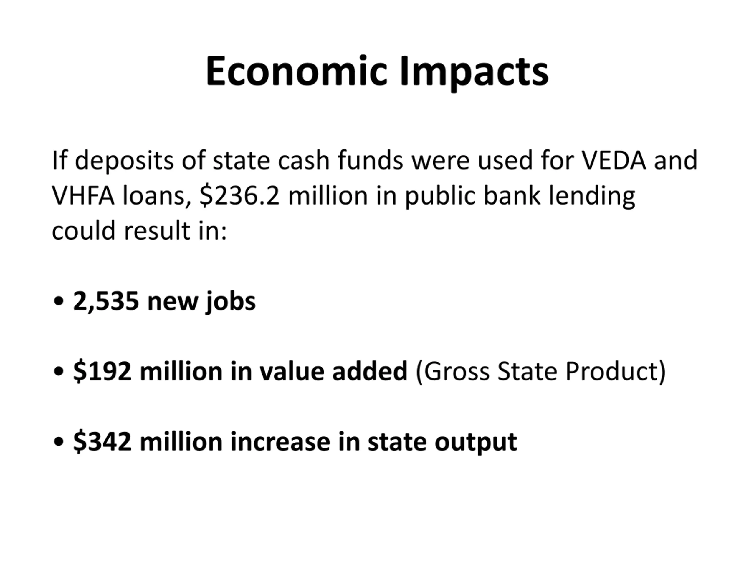 Economic Impacts If deposits of state cash funds were used for VEDA and VHFA loans, $236.2 million in public bank lending could result in: 2,535 new jobs $192 million in value added (Gross State Product) $342 million increase in state output