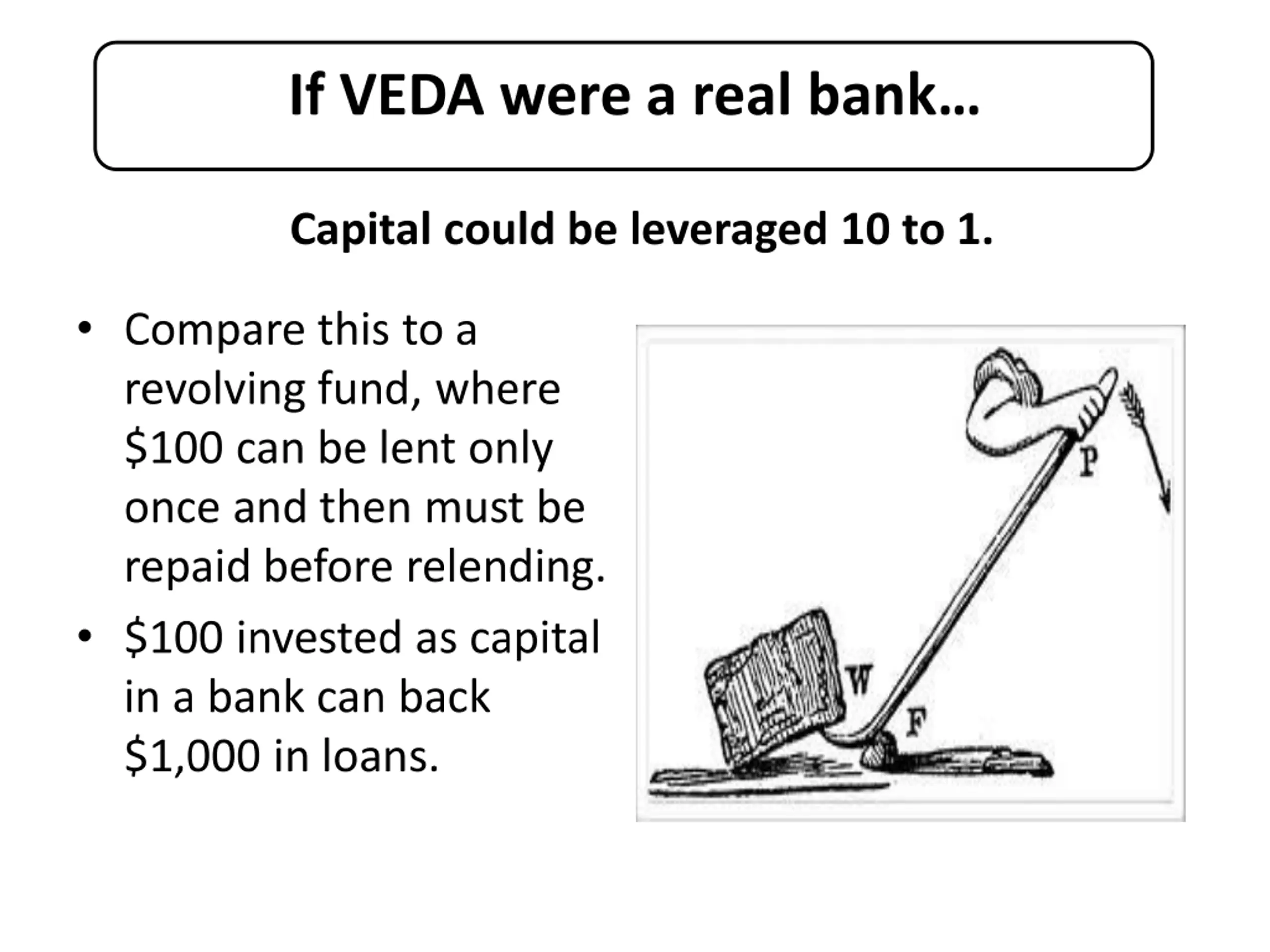 If VEDA were a real bank Capital could be leveraged 10 to 1. Compare this to a revolving fund, where $100 can be lent only once and then must be repaid before relending. $100 invested as capital in a bank can back $1,000 in loans.