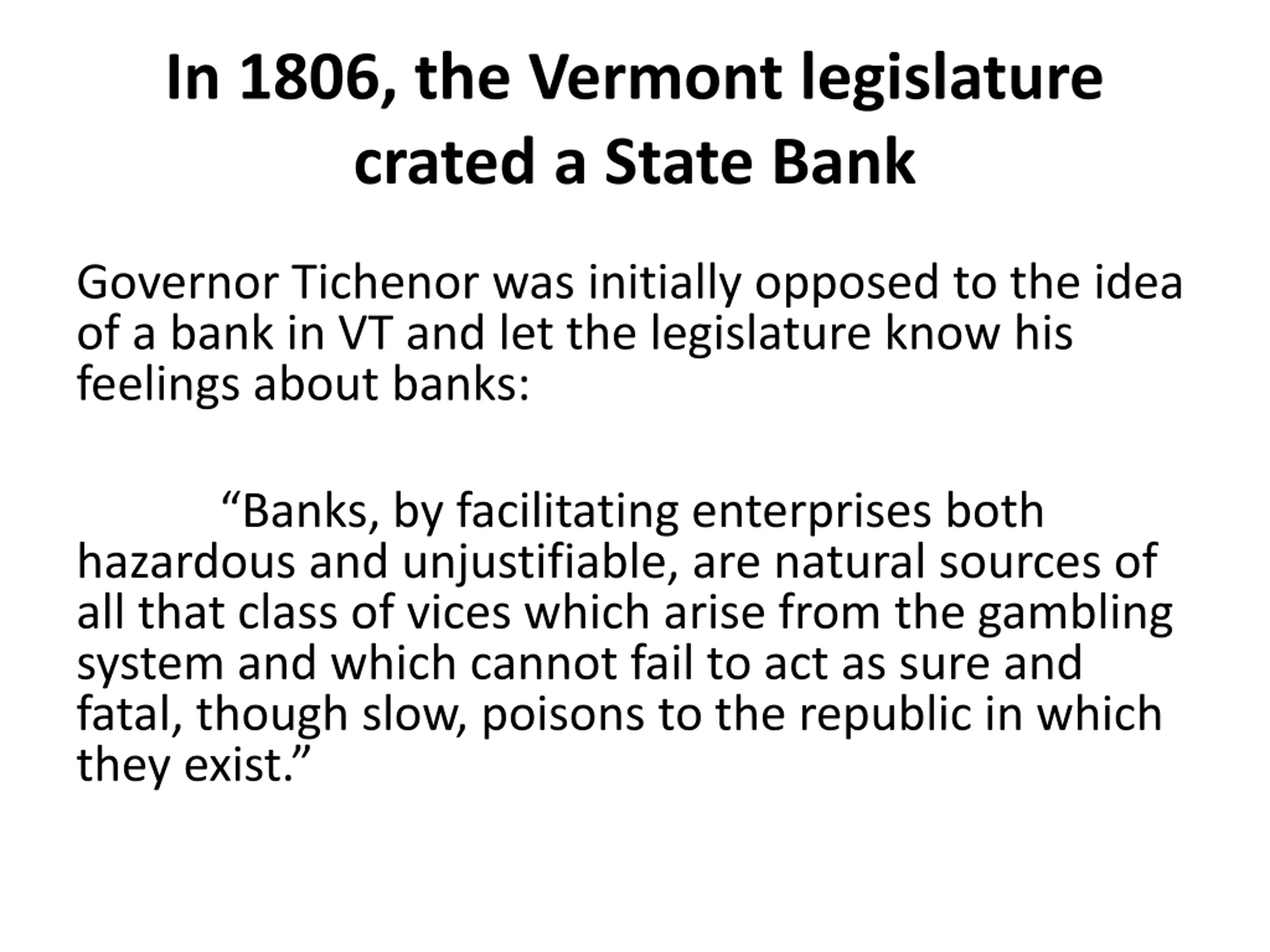 In 1806, the Vermont legislature crated a State Bank Governor Tichenor was initially opposed to the idea of a bank in VT and let the legislature know his feelings about banks: Banks, by facilitating enterprises both hazardous and unjustifiable, are natural sources of all that class of vices which arise from the gambling system and which cannot fail to act as sure and fatal, though slow, poisons to the republic in which they exist.