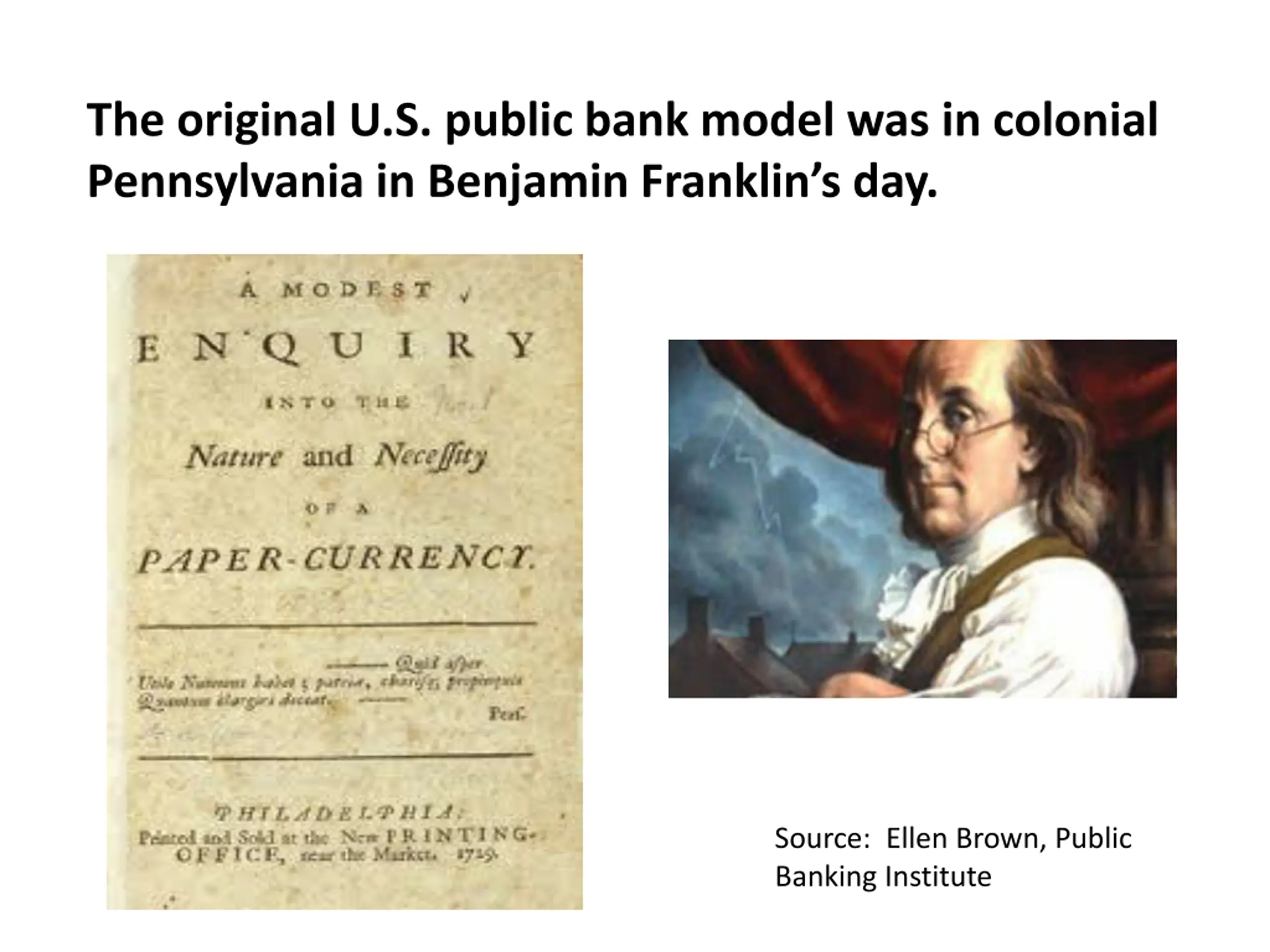 The original U.S. public bank model was in colonial Pennsylvania in Benjamin Franklin s day. Source: Ellen Brown, Public Banking Institute