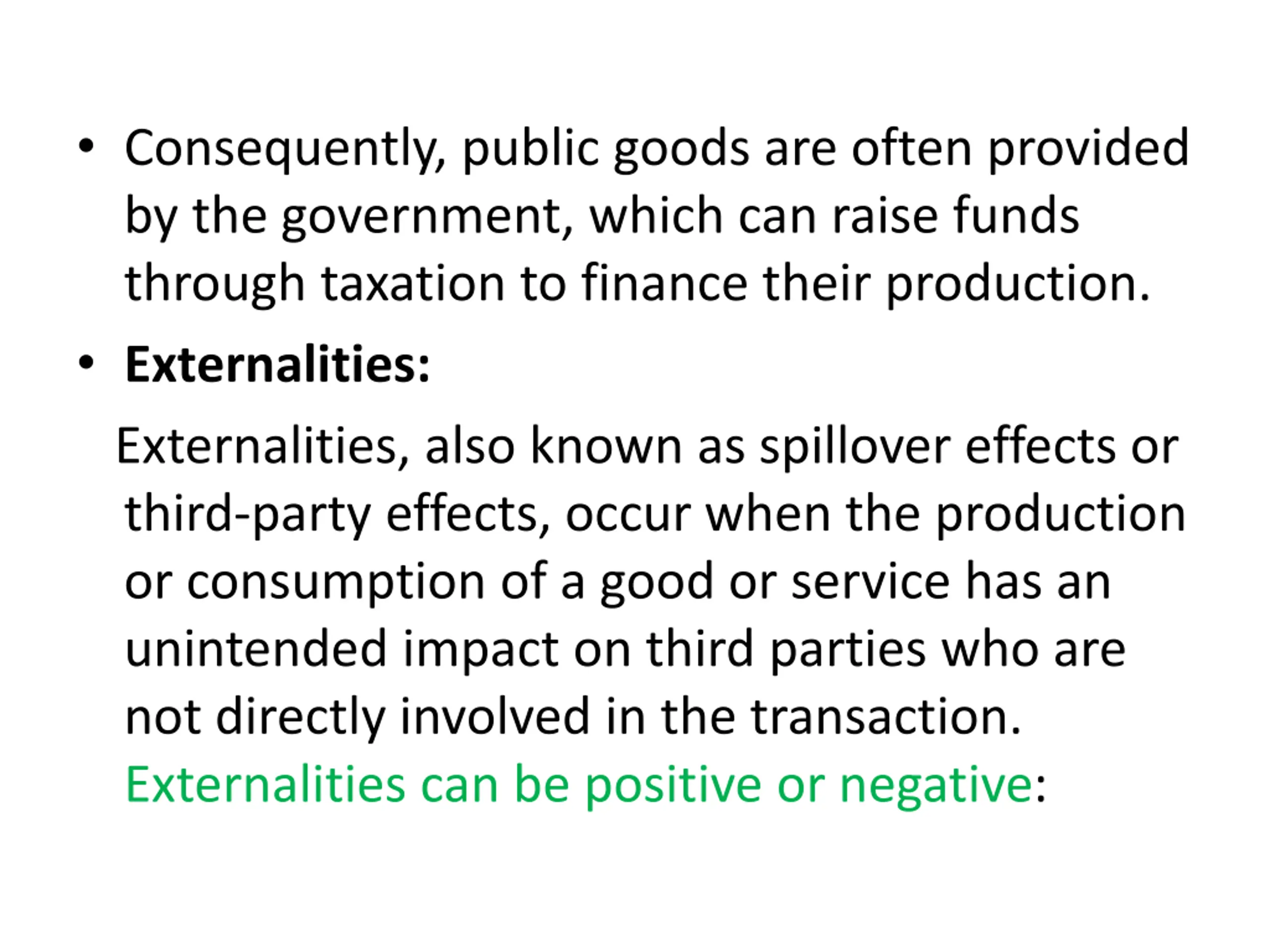 Consequently, public goods are often provided by the government, which can raise funds through taxation to finance their production. Externalities: Externalities, also known as spillover effects or third-party effects, occur when the production or consumption of a good or service has an unintended impact on third parties who are not directly involved in the transaction. Externalities can be positive or negative: