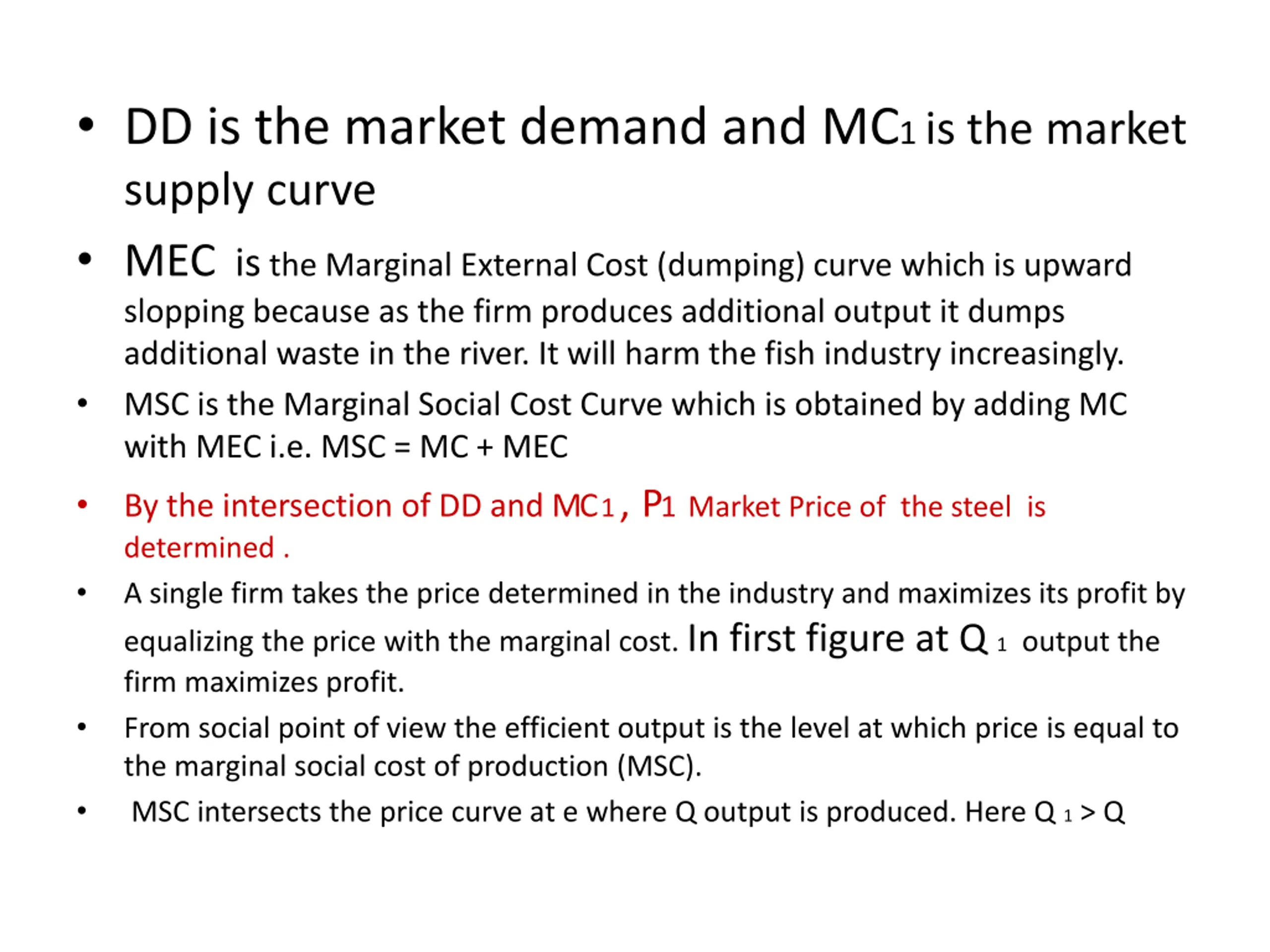 DD is the market demand and MC1 is the market supply curve MEC is the Marginal External Cost (dumping) curve which is upward slopping because as the firm produces additional output it dumps additional waste in the river. It will harm the fish industry increasingly. MSC is the Marginal Social Cost Curve which is obtained by adding MC with MEC i.e. MSC = MC + MEC By the intersection of DD and MC 1 , P1 Market Price of the steel is determined . A single firm takes the price determined in the industry and maximizes its profit by equalizing the price with the marginal cost. In first figure at Q 1 output the firm maximizes profit. From social point of view the efficient output is the level at which price is equal to the marginal social cost of production (MSC). MSC intersects the price curve at e where Q output is produced. Here Q 1 > Q