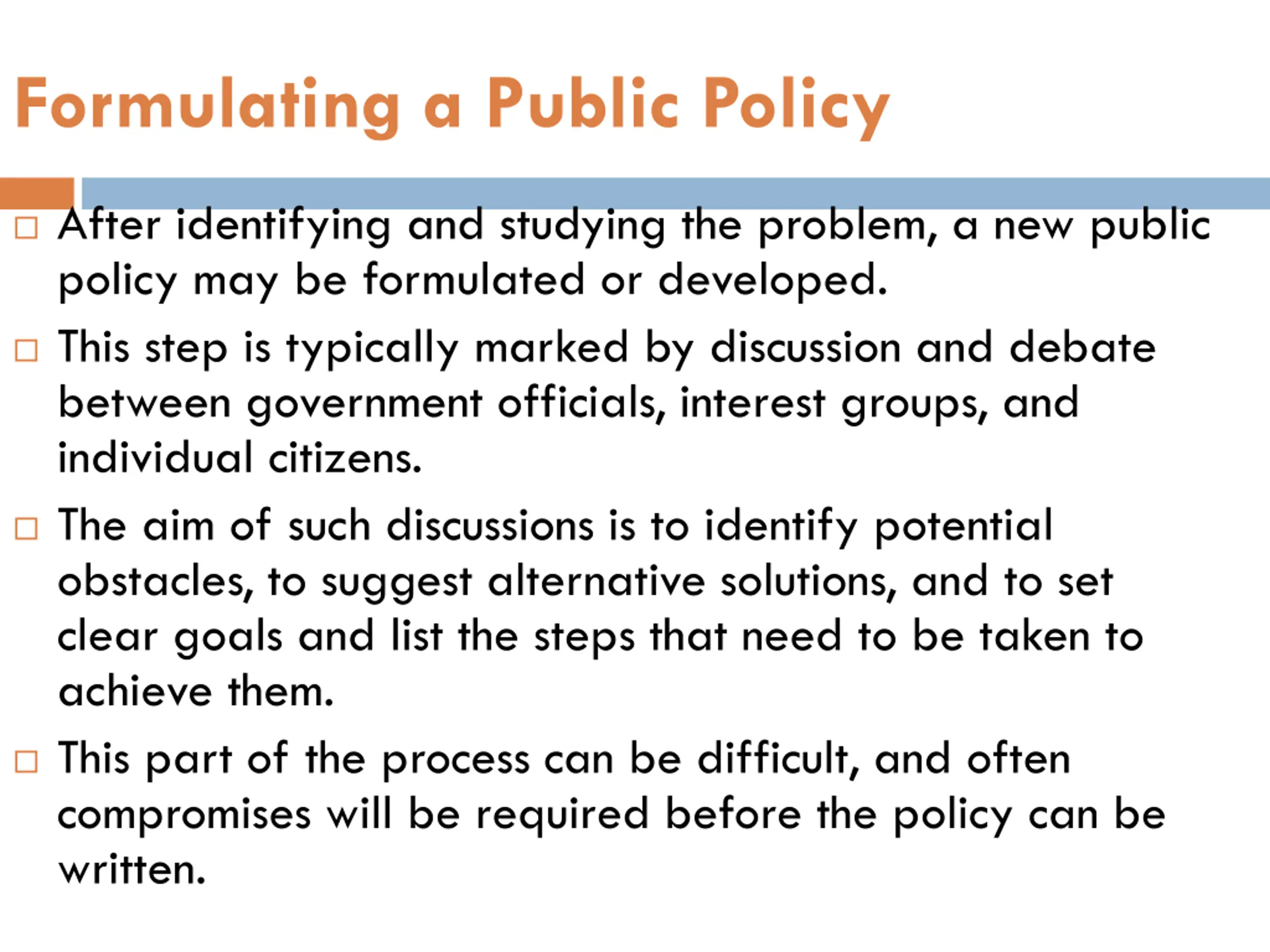 Formulating a Public Policy After identifying and studying the problem, a new public policy may be formulated or developed. This step is typically marked by discussion and debate between government officials, interest groups, and individual citizens. The aim of such discussions is to identify potential obstacles, to suggest alternative solutions, and to set clear goals and list the steps that need to be taken to achieve them. This part of the process can be difficult, and often compromises will be required before the policy can be written.