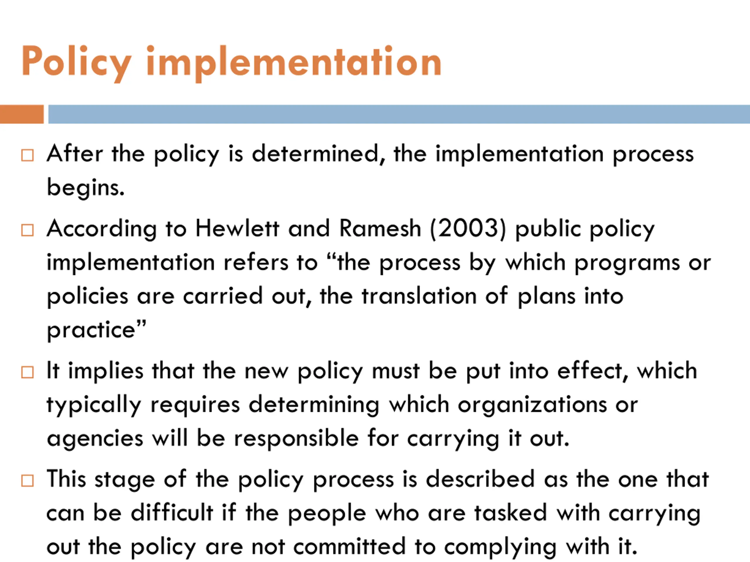 Policy implementation After the policy is determined, the implementation process begins. According to Hewlett and Ramesh (2003) public policy implementation refers to the process by which programs or policies are carried out, the translation of plans into practice It implies that the new policy must be put into effect, which typically requires determining which organizations or agencies will be responsible for carrying it out. This stage of the policy process is described as the one that can be difficult if the people who are tasked with carrying out the policy are not committed to complying with it.