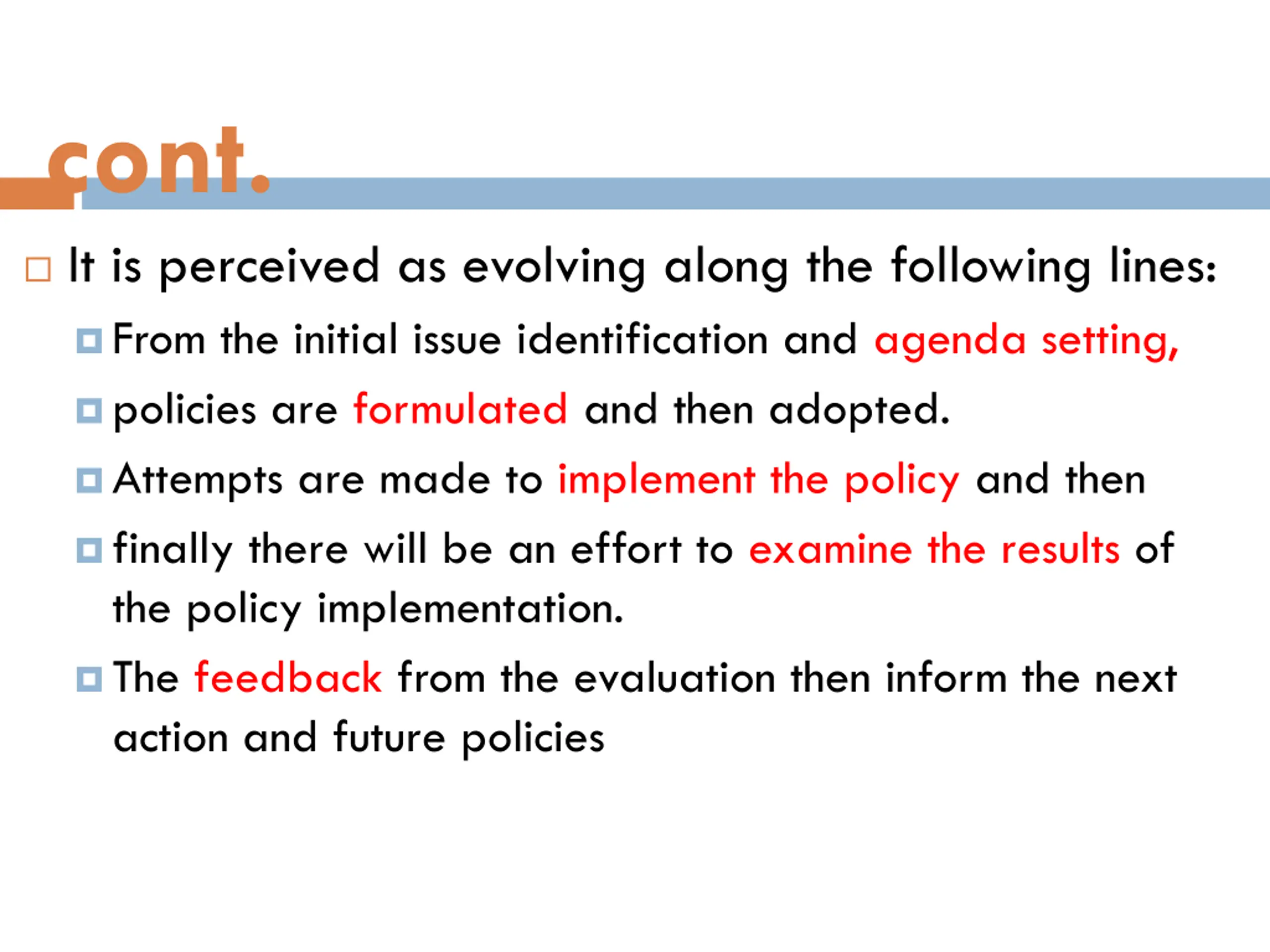 cont. It is perceived as evolving along the following lines: From the initial issue identification and agenda setting, policies are formulated and then adopted. Attempts are made to implement the policy and then finally there will be an effort to examine the results of the policy implementation. The feedback from the evaluation then inform the next action and future policies
