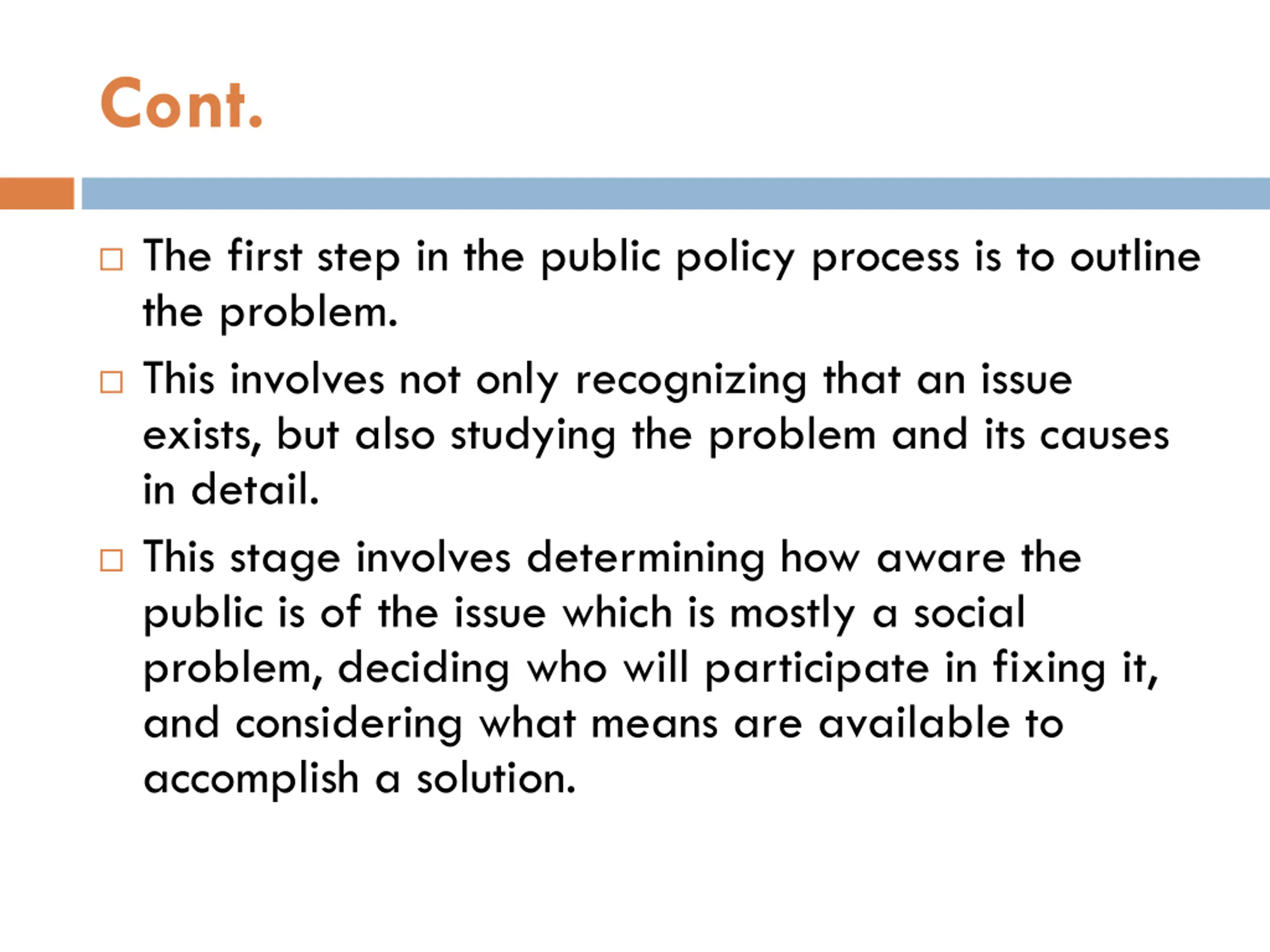 Cont. The first step in the public policy process is to outline the problem. This involves not only recognizing that an issue exists, but also studying the problem and its causes in detail. This stage involves determining how aware the public is of the issue which is mostly a social problem, deciding who will participate in fixing it, and considering what means are available to accomplish a solution.