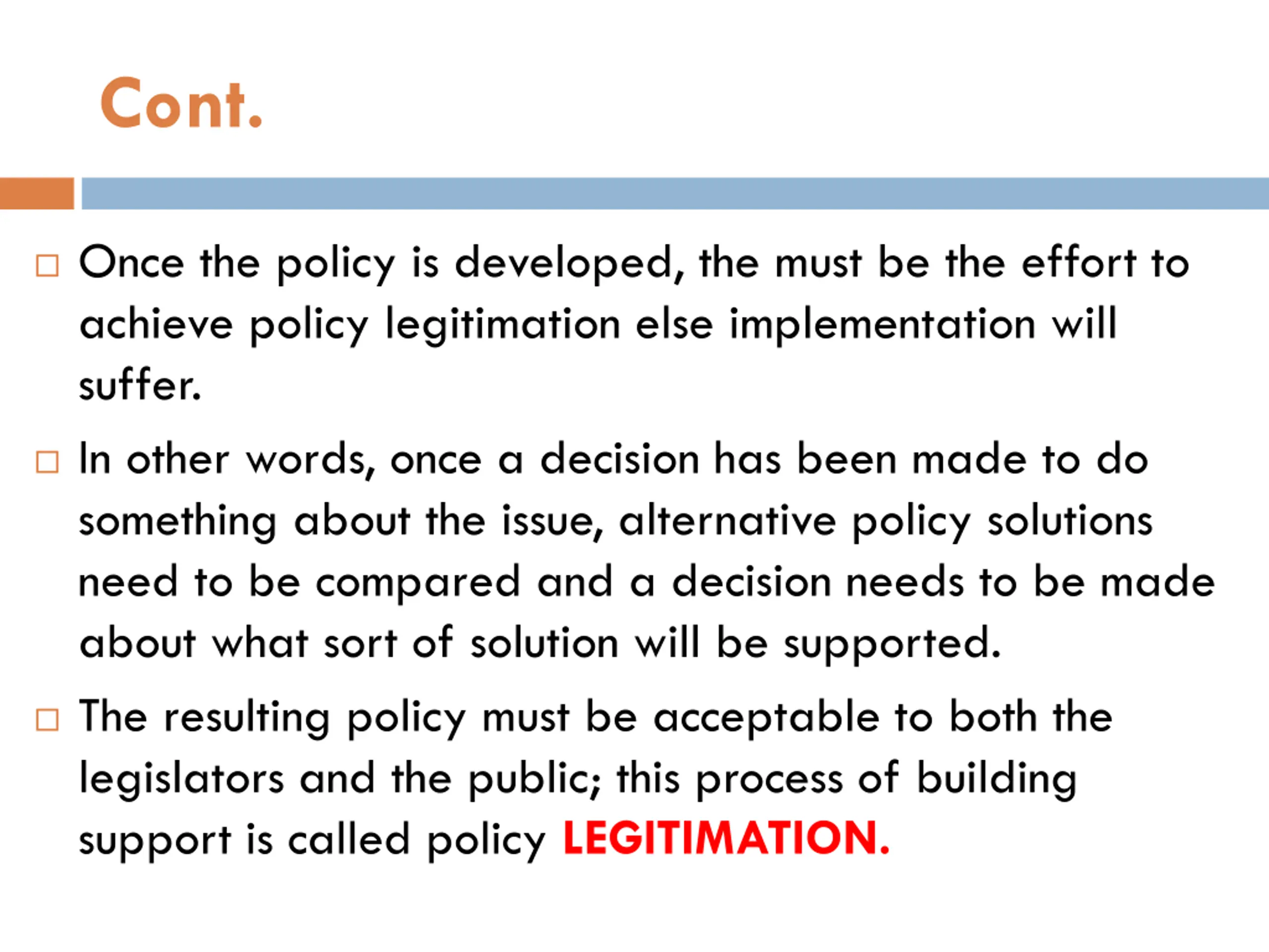 Cont. Once the policy is developed, the must be the effort to achieve policy legitimation else implementation will suffer. In other words, once a decision has been made to do something about the issue, alternative policy solutions need to be compared and a decision needs to be made about what sort of solution will be supported. The resulting policy must be acceptable to both the legislators and the public; this process of building support is called policy LEGITIMATION.