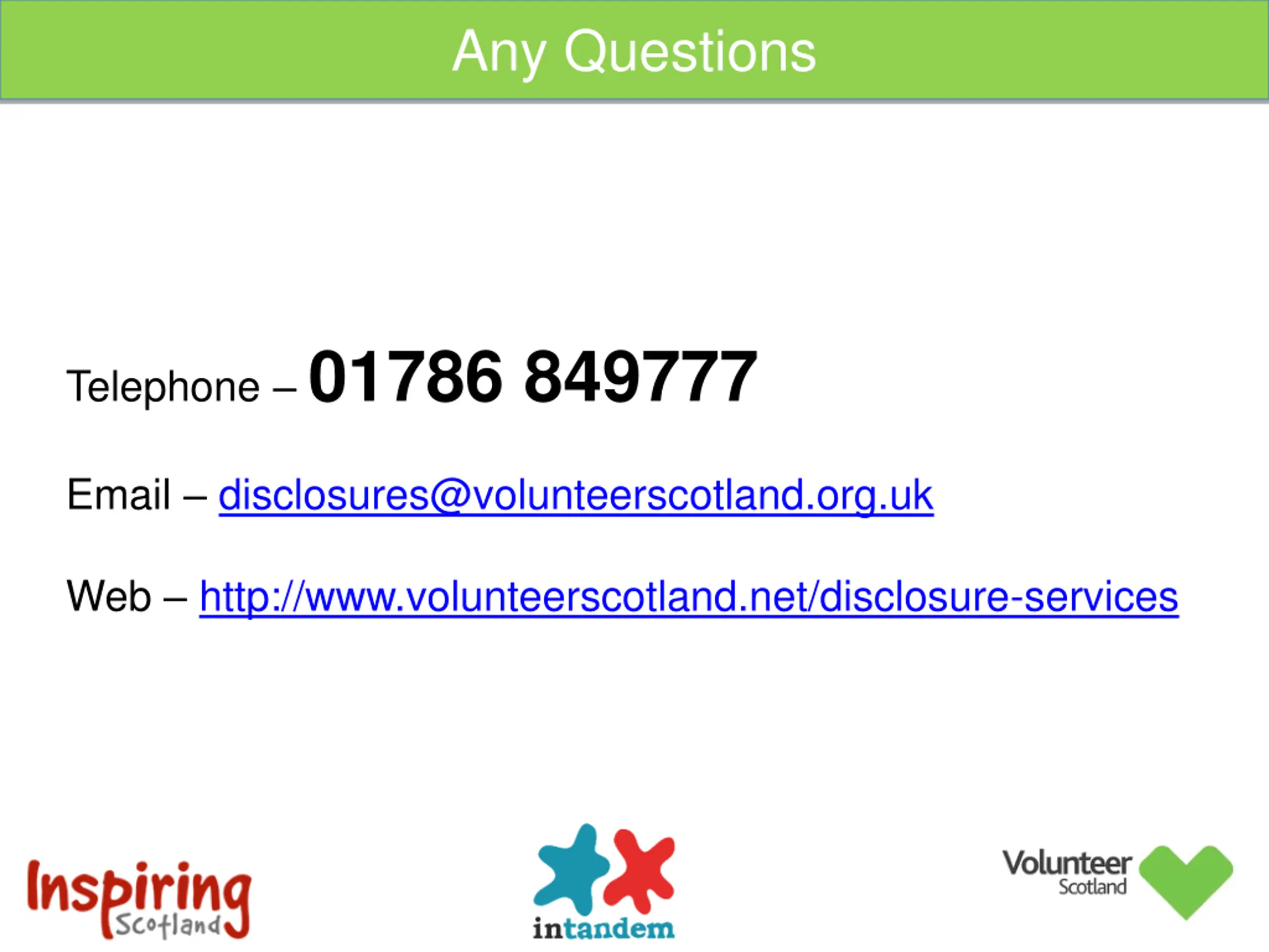 Any Questions Telephone 01786 849777 Email disclosures@volunteerscotland.org.uk Web http://www.volunteerscotland.net/disclosure-services Slide 18