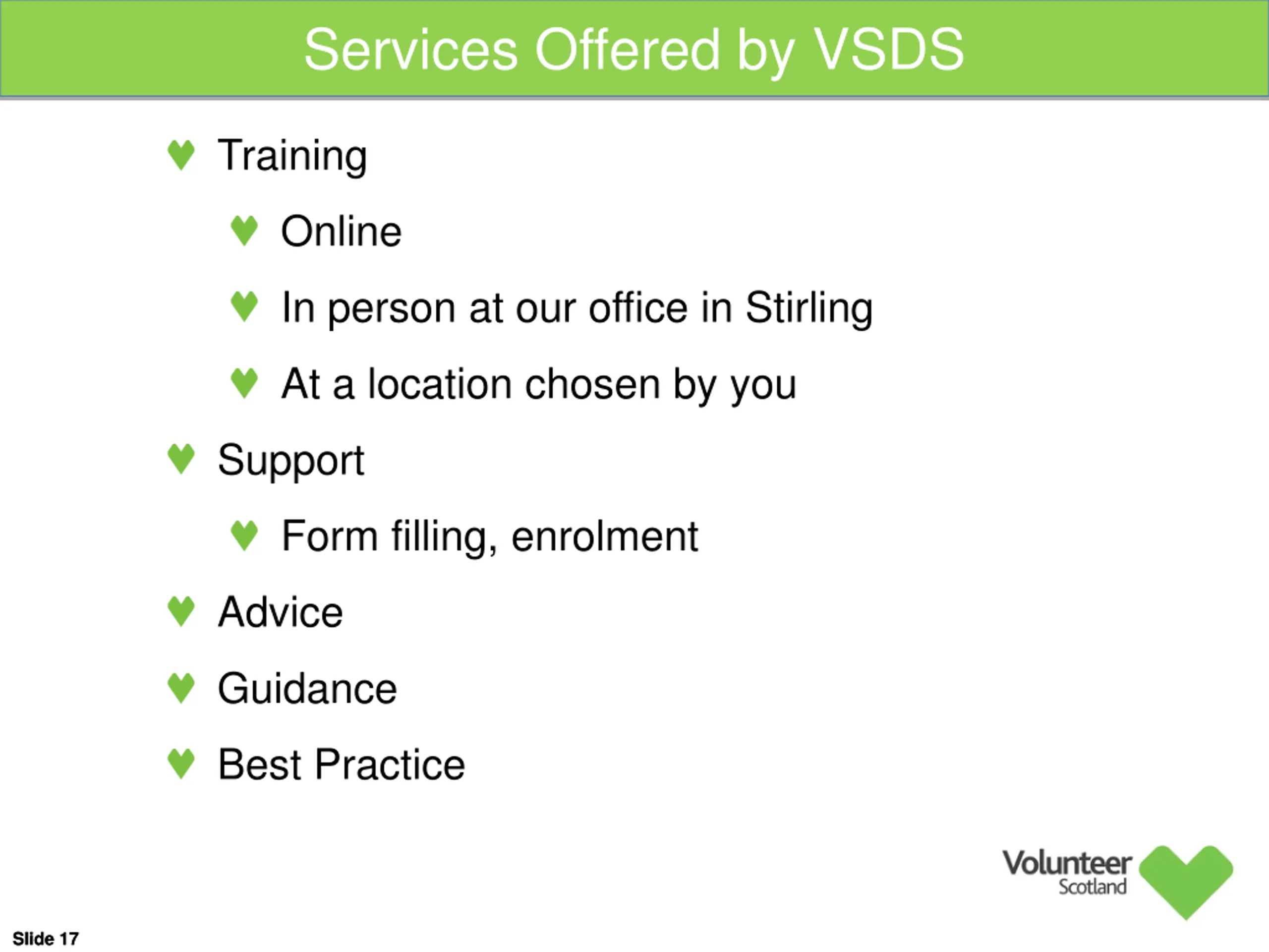 Services Offered by VSDS Training Online In person at our office in Stirling At a location chosen by you Support Form filling, enrolment Advice Guidance Best Practice Slide 17 Slide 17