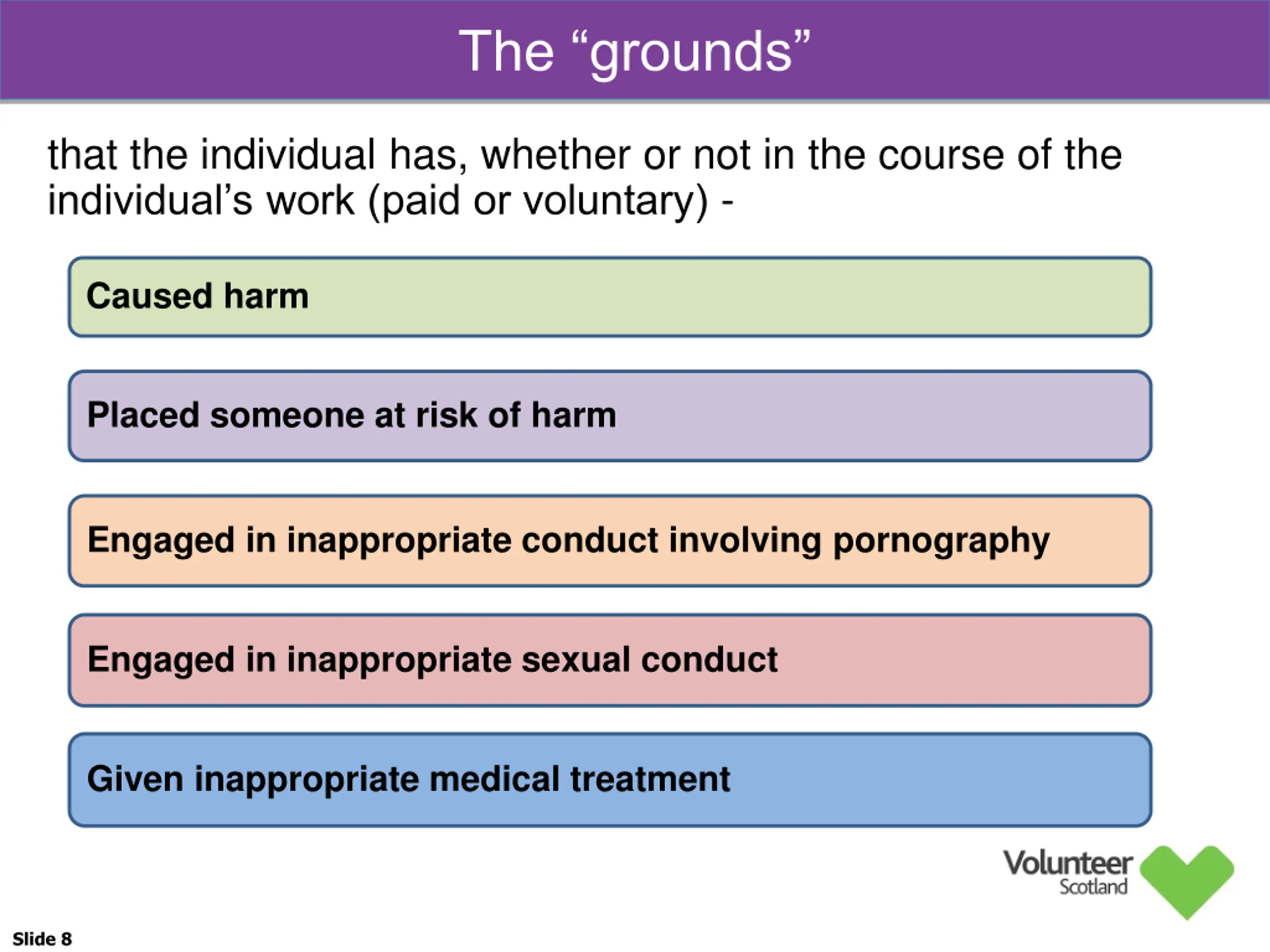 The grounds that the individual has, whether or not in the course of the individual s work (paid or voluntary) - Caused harm Placed someone at risk of harm Engaged in inappropriate conduct involving pornography Engaged in inappropriate sexual conduct Given inappropriate medical treatment Slide 8