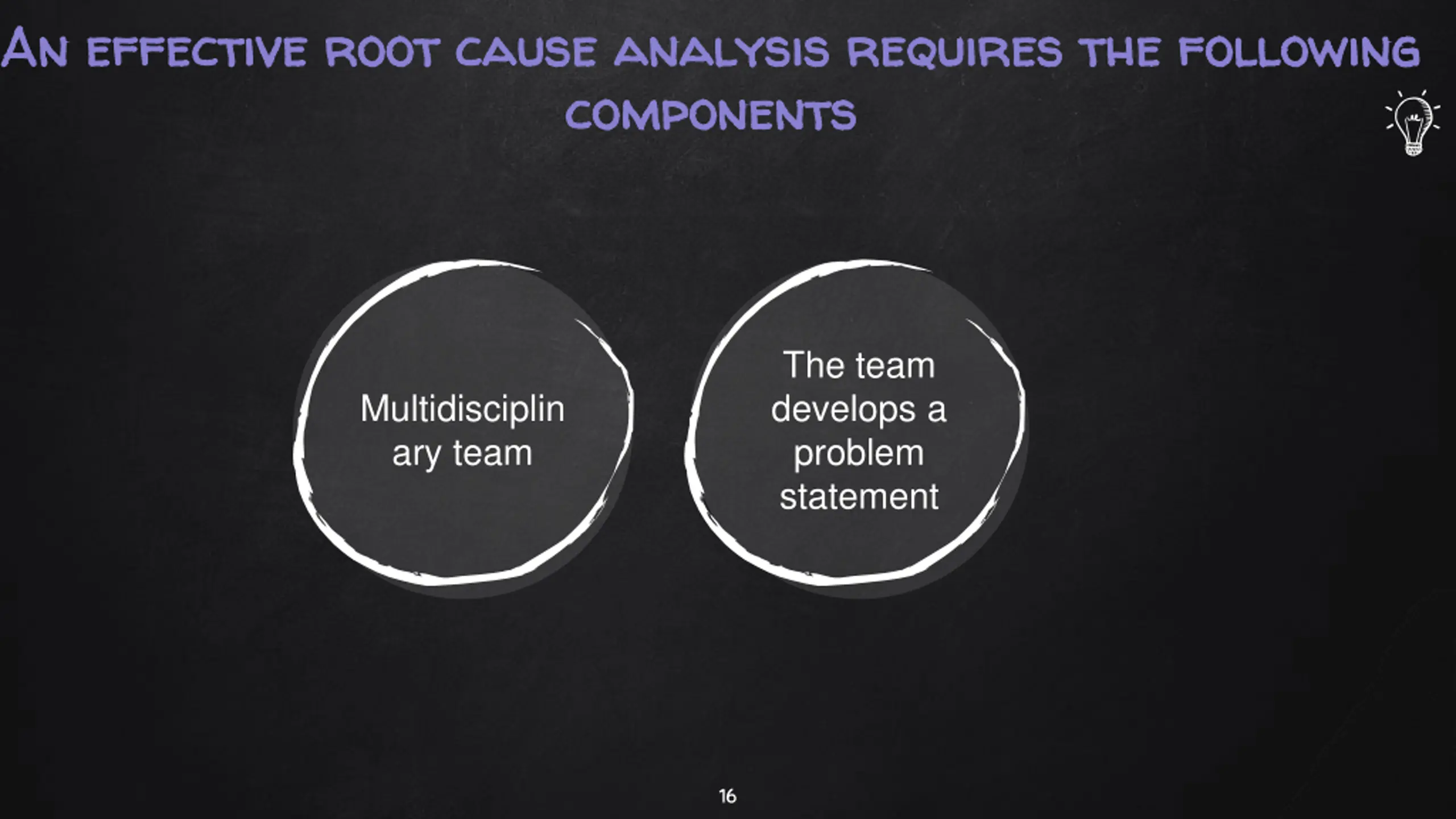 An effective root cause analysis requires the following An effective root cause analysis requires the following components components The team develops a problem statement Multidisciplin ary team 16